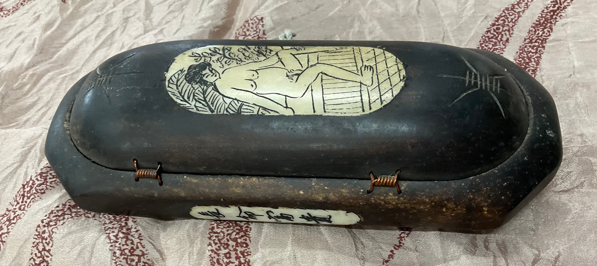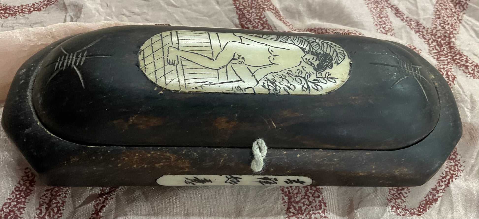 - Case: Handmade wooden box with erotic scrimshaw-style artwork