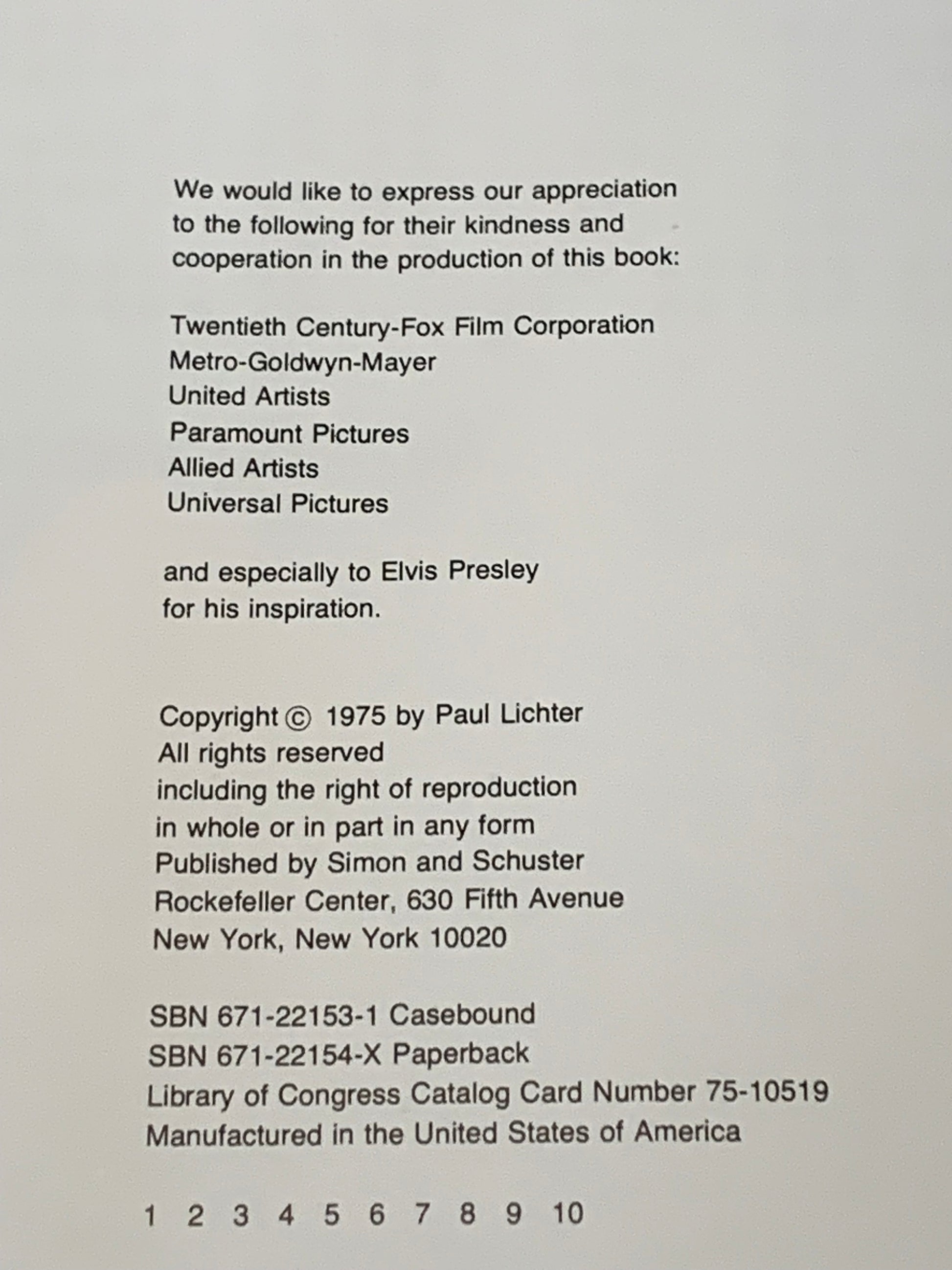 The copyright page acknowledges cooperation from major Hollywood studios including Twentieth Century-Fox, Metro-Goldwyn-Mayer, United Artists, Paramount Pictures, Allied Artists, and Universal Pictures, “and especially to Elvis Presley for his inspiration.”