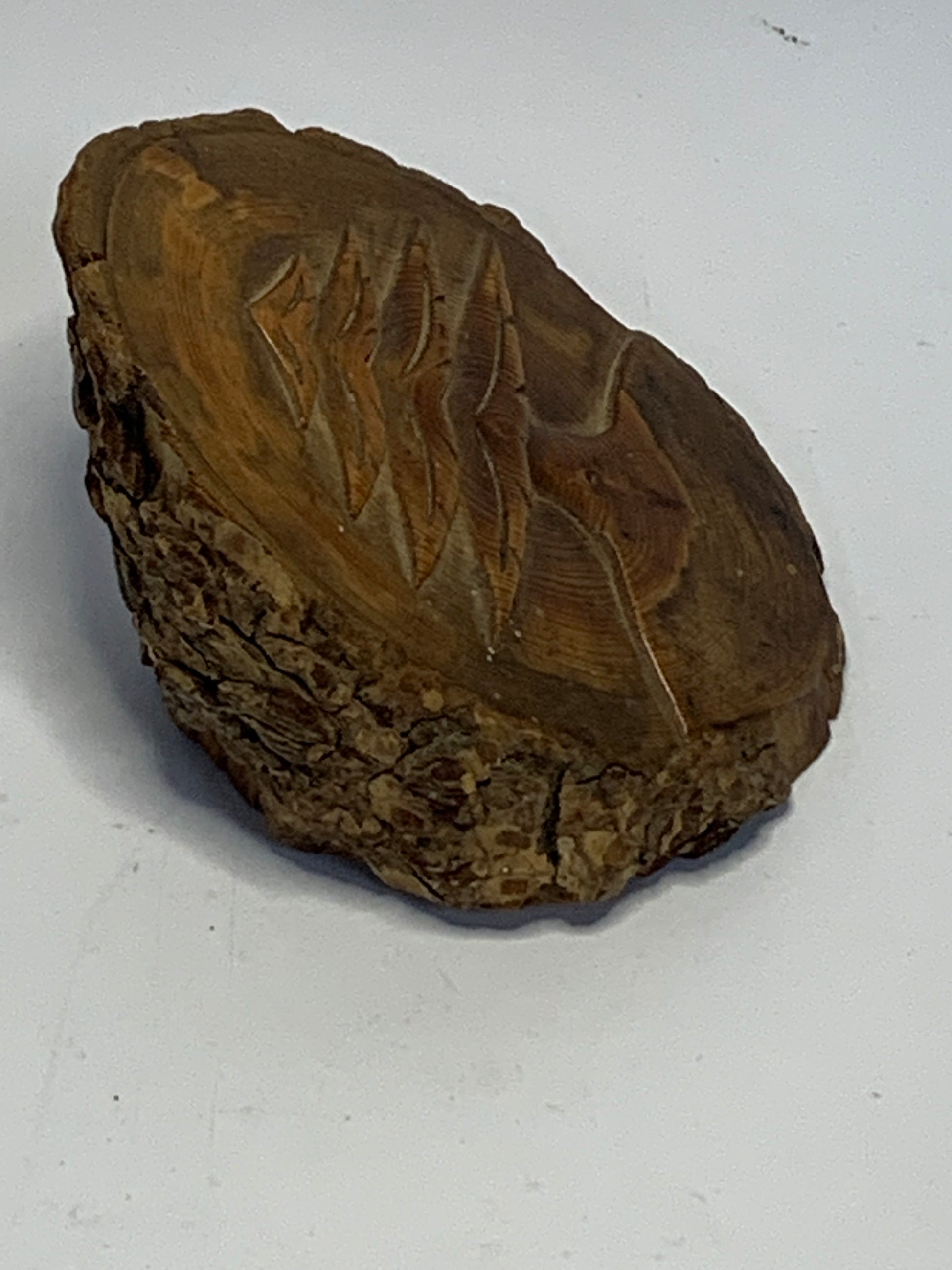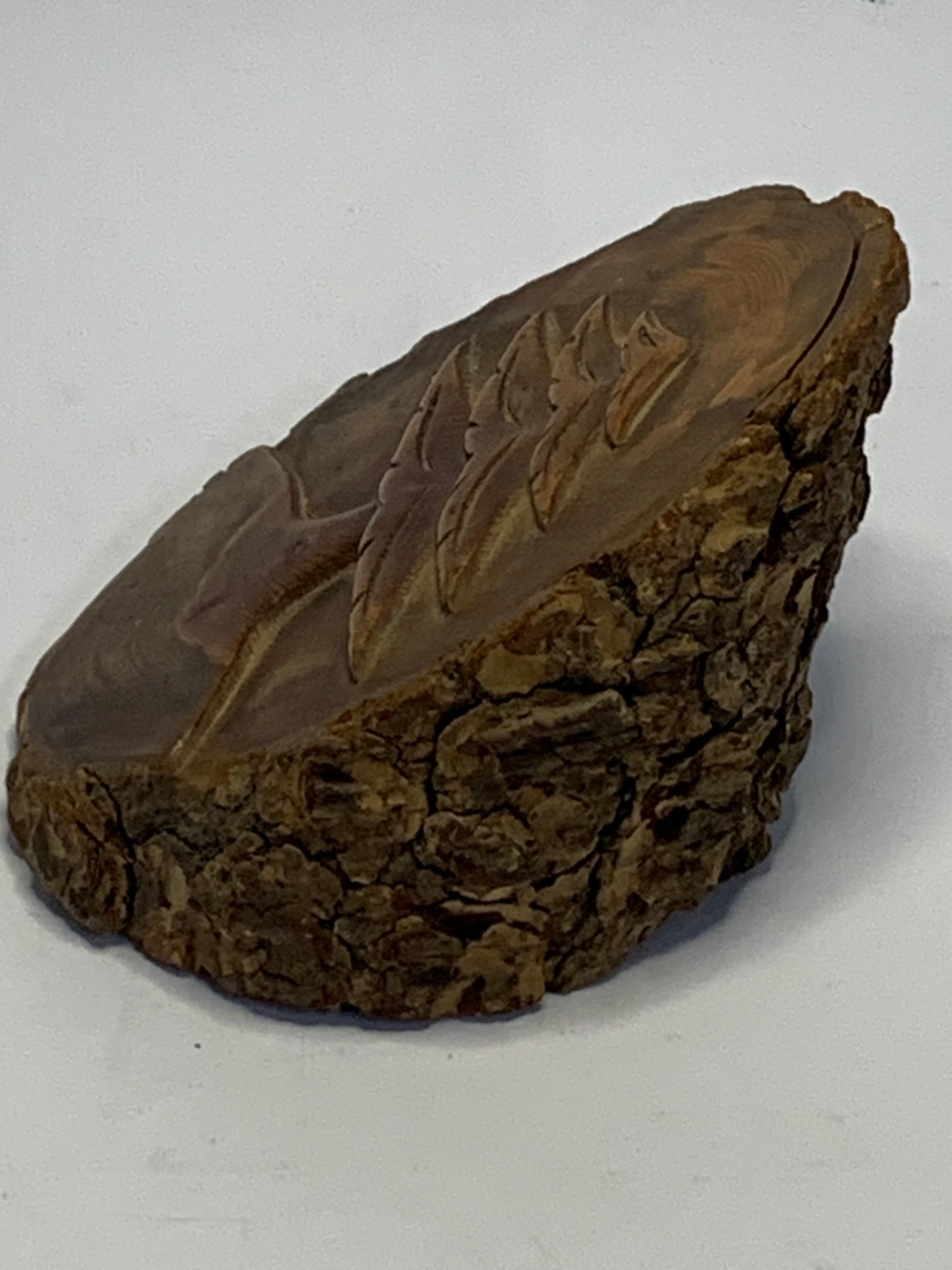 Hand Carved Wood Slice featuring a detailed evergreen tree design carved in relief