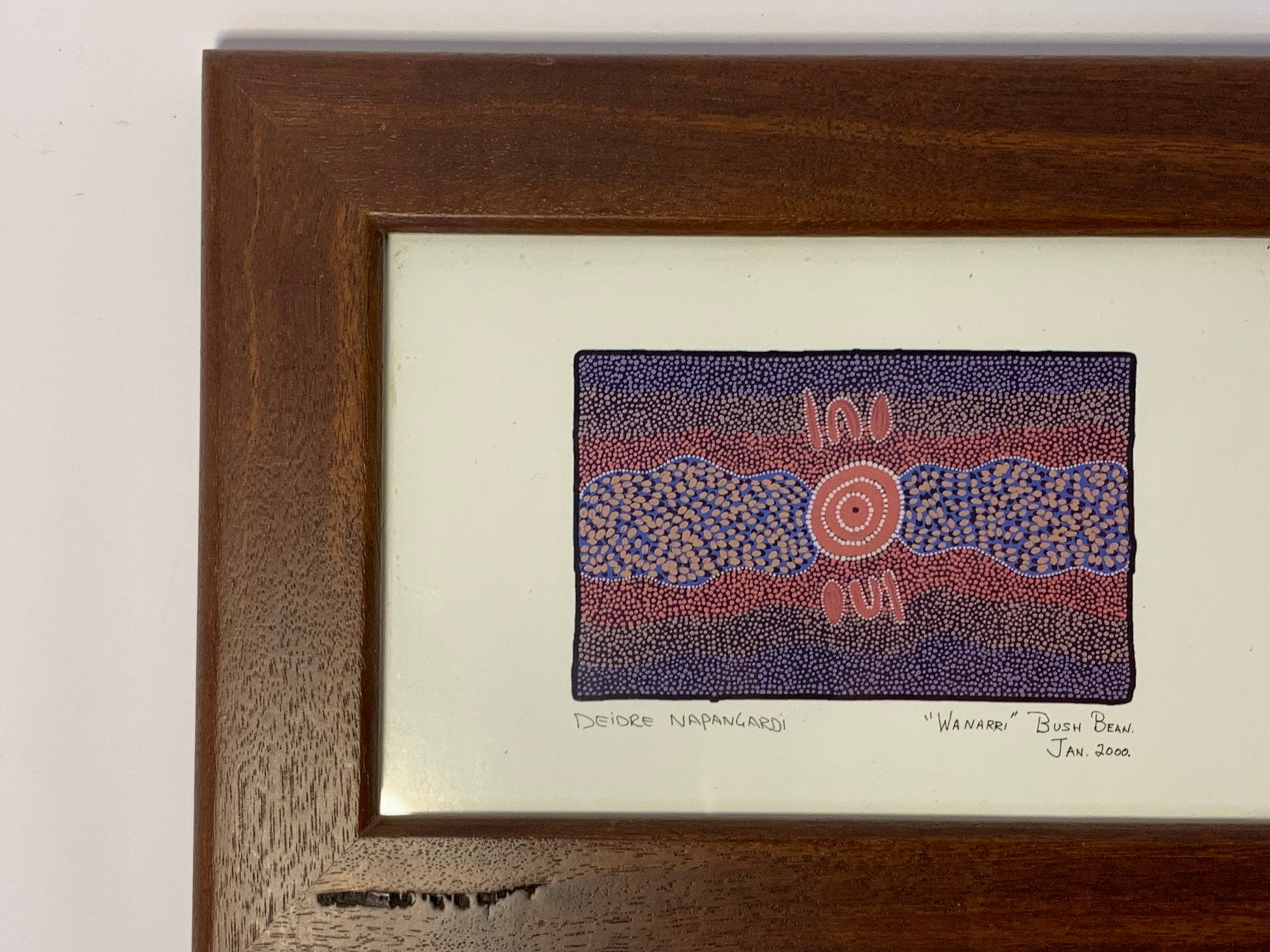 Original Aboriginal dot painting by Deidre Napangardi titled “Wanarri” (Bush Bean), created in January 2000