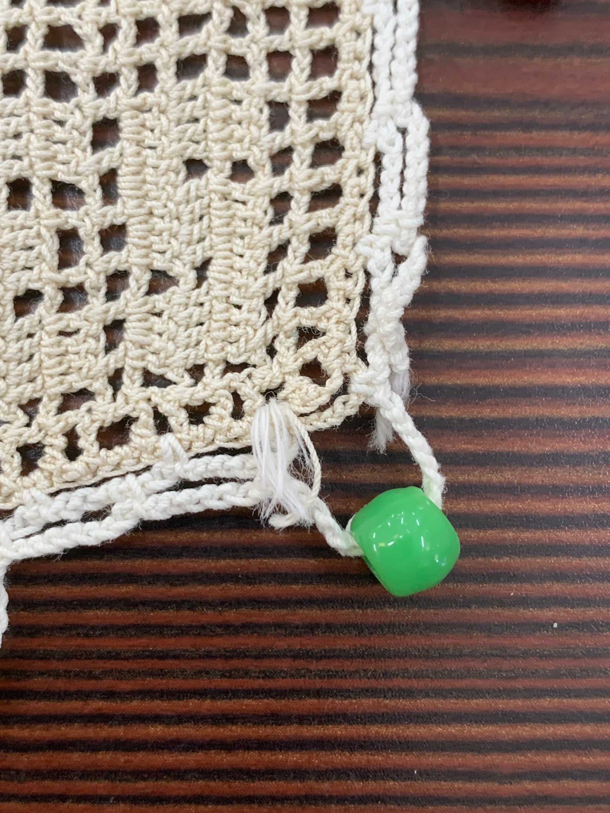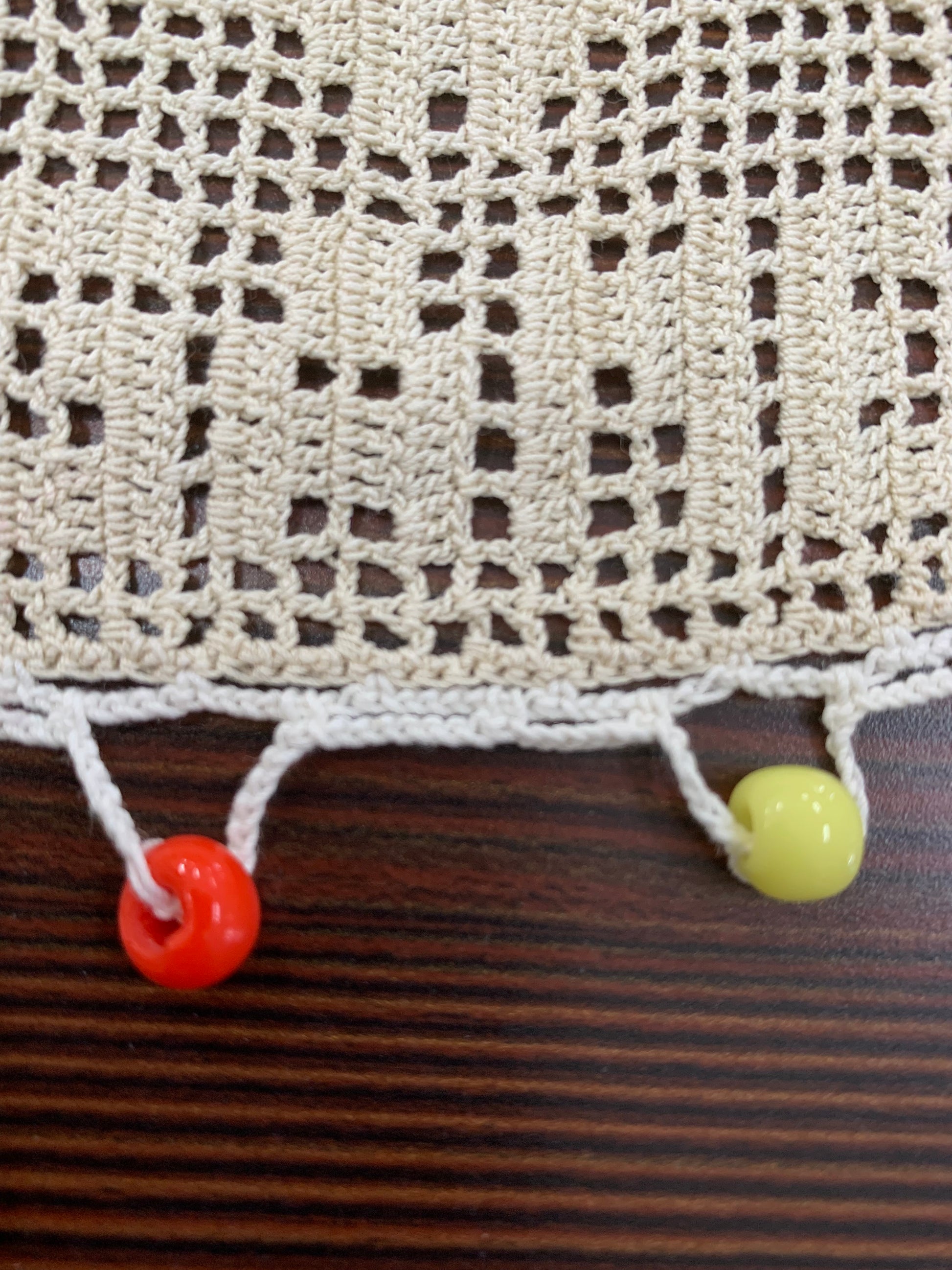 ∙ Decorative Detail: Colorful glass beads (red, yellow, and green) around the edge served dual purpose as weights to keep flies away from milk jugs and prevent the cover from blowing away
