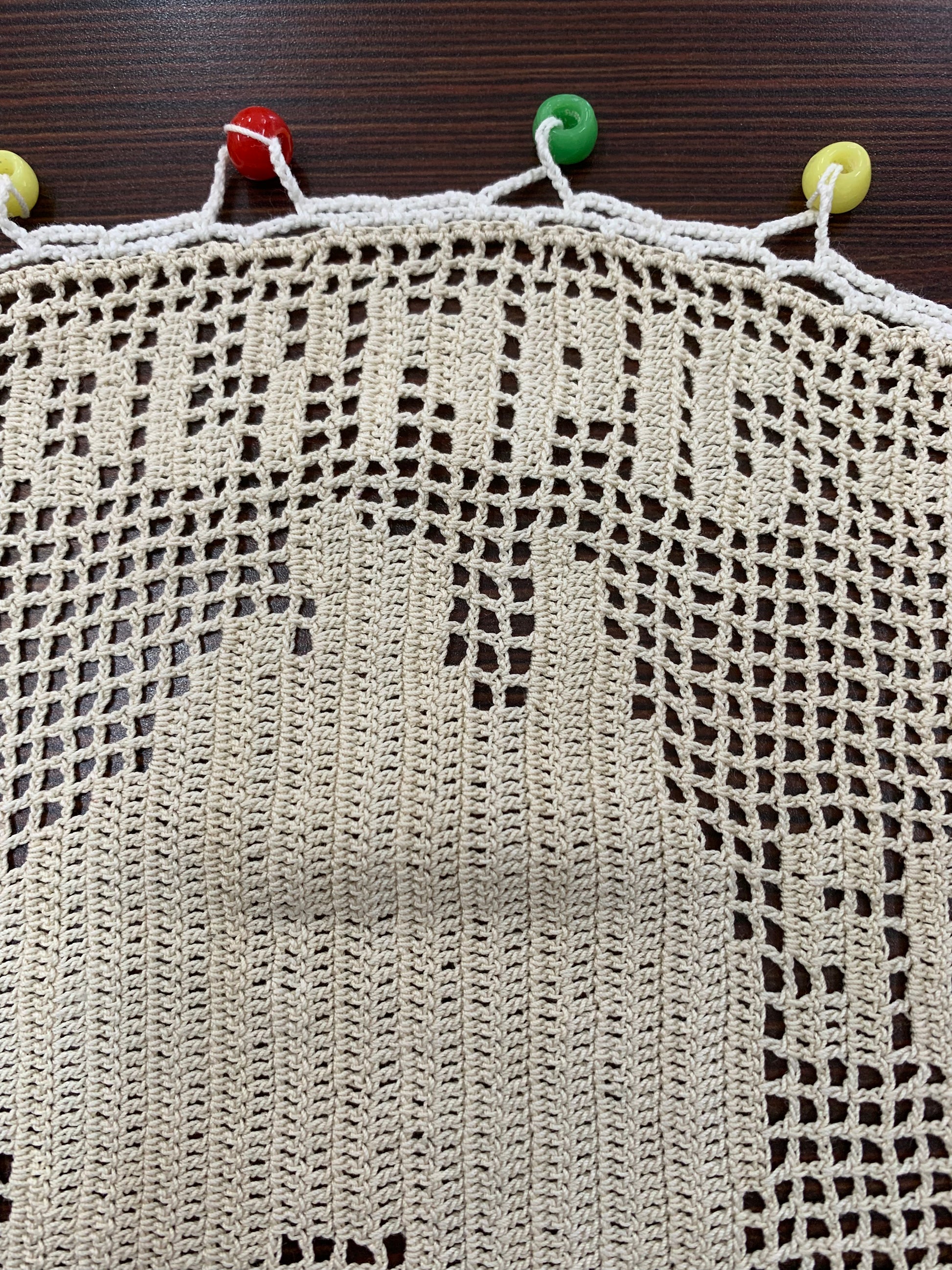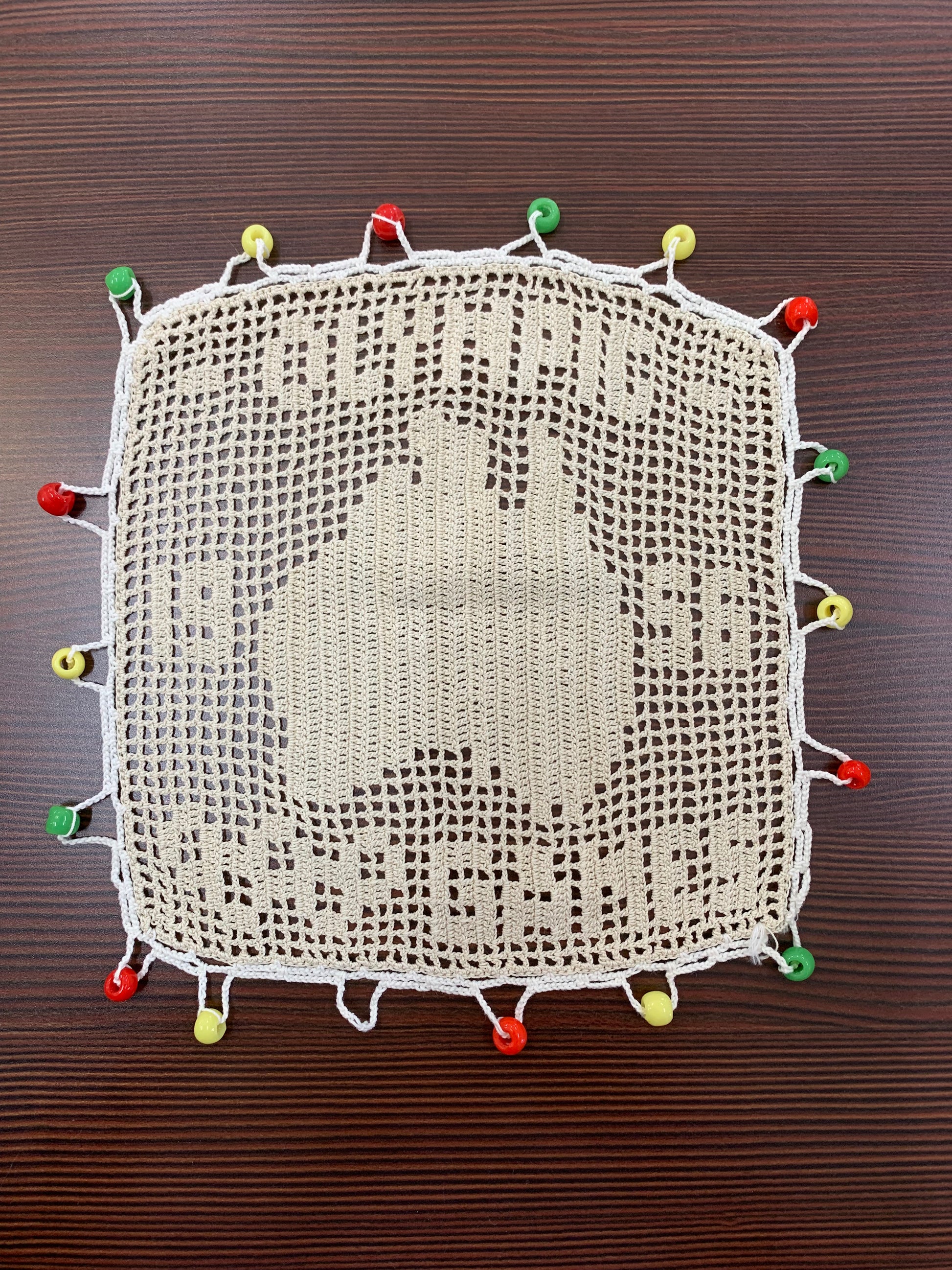 Condition: Good vintage condition with age-appropriate wear. Natural darkening of thread consistent with 68+ years of age, minor looseness in some corner loops, and one glass bead missing (likely green or yellow based on color pattern). Otherwise structurally sound with all other beads intact.