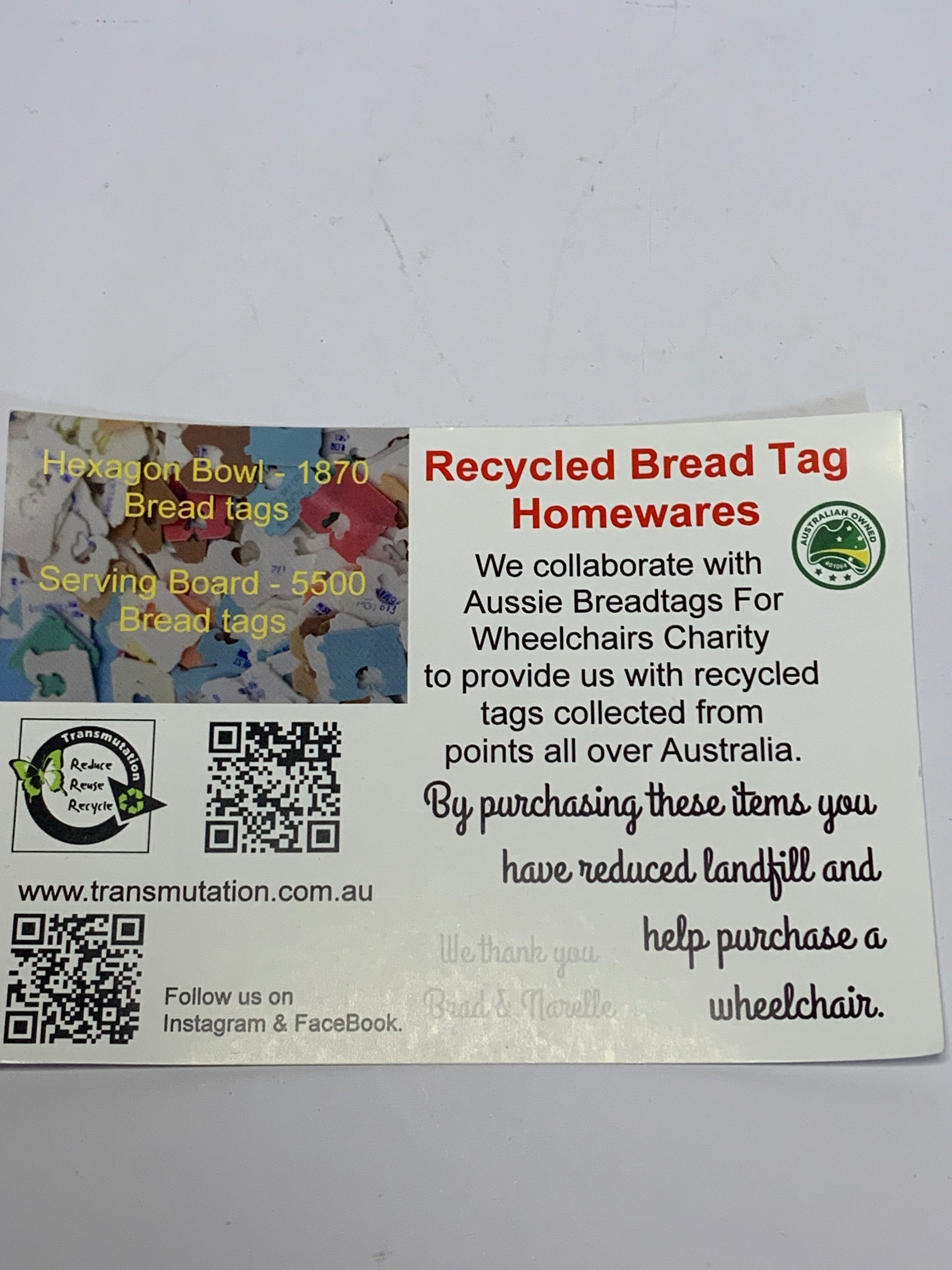 Made by Transmutation in Robe, South Australia, in collaboration with Aussie Breadtags For Wheelchairs Charity, this bowl represents a meaningful contribution to both environmental sustainability and social good. The bread tags used would otherwise end up in landfills, and purchases help fund wheelchair acquisitions.