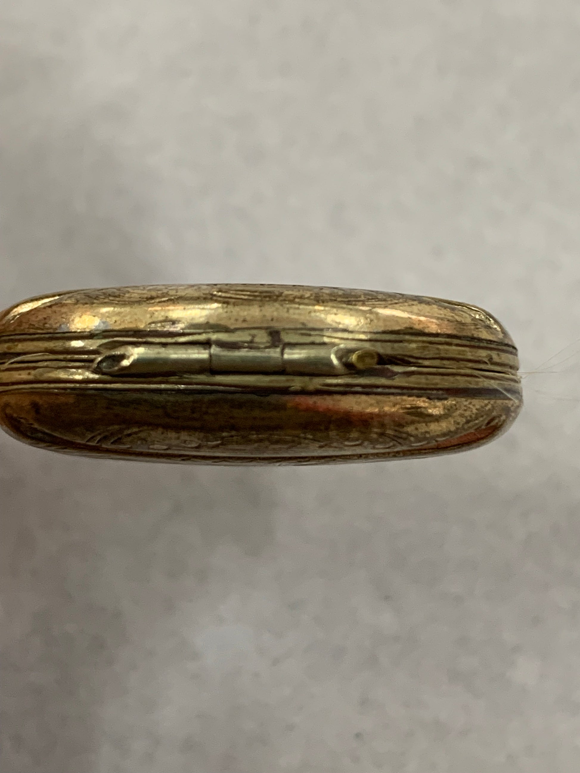 This ornate gold-toned oval locket features intricate engraved decoration with flowing foliate patterns and rope-twist borders characteristic of Victorian craftsmanship. The pendant opens to reveal two compartments with deep blue lining, each containing carefully preserved locks of blonde/light brown hair arranged in delicate coiled patterns. The hair is twisted into small spirals, which was a common Victorian practice for preserving memorial hair. The locket has a sturdy bail for hanging and shows beautiful attention to detail in both the exterior engraving and interior presentation.