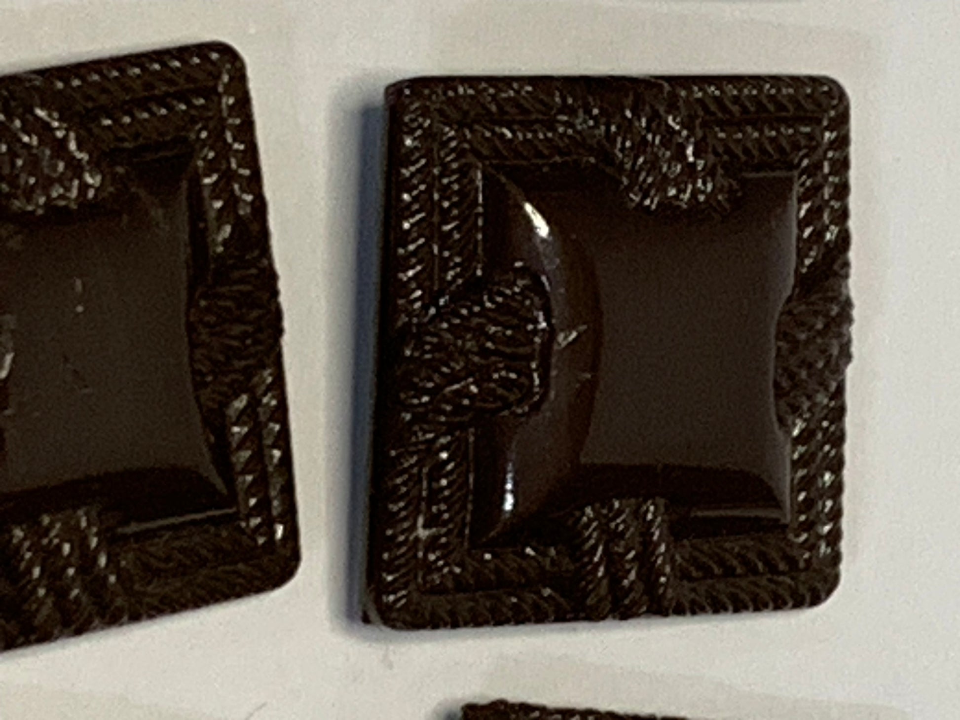 • Set of 10 matching square brown glass buttons with intricate textured borders