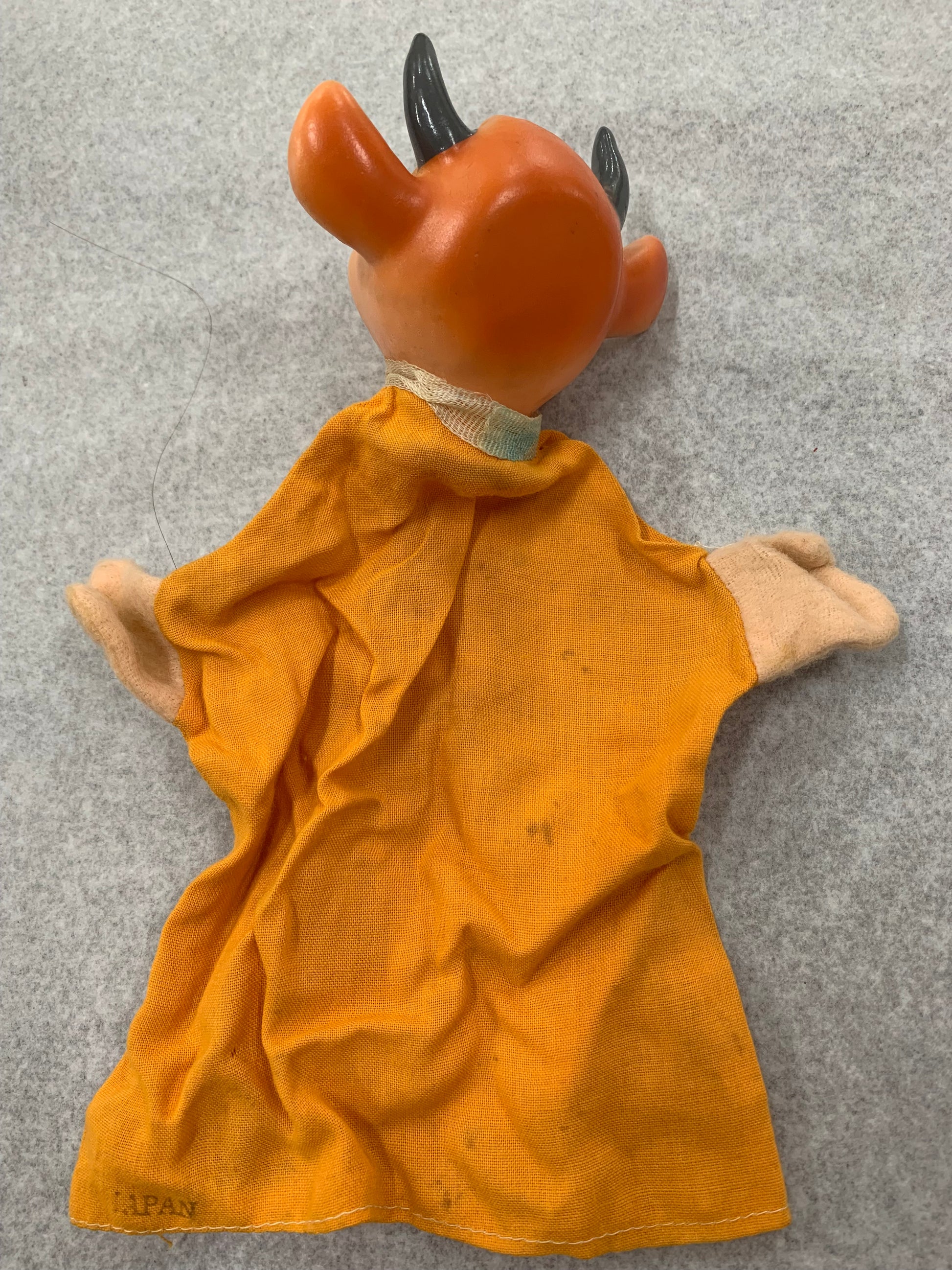 Construction: The head is made of soft vinyl or rubber material common in Japanese toys of that period, while the body is simple cotton fabric sewn into a puppet sleeve.
