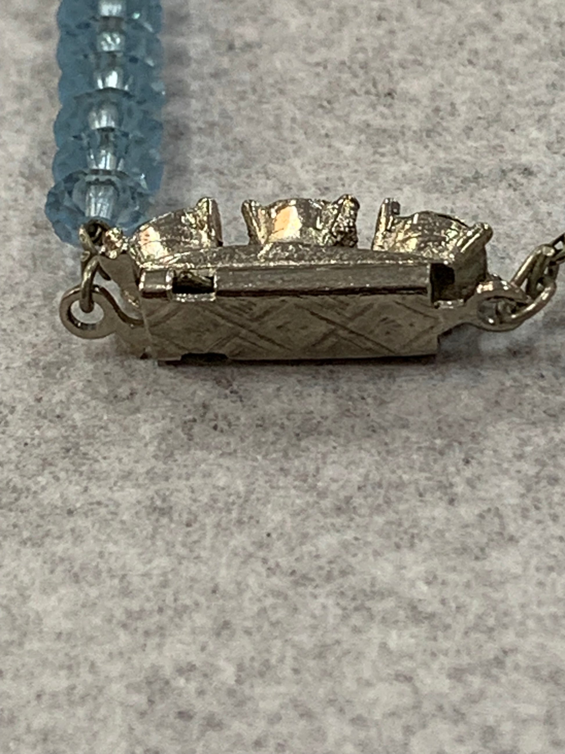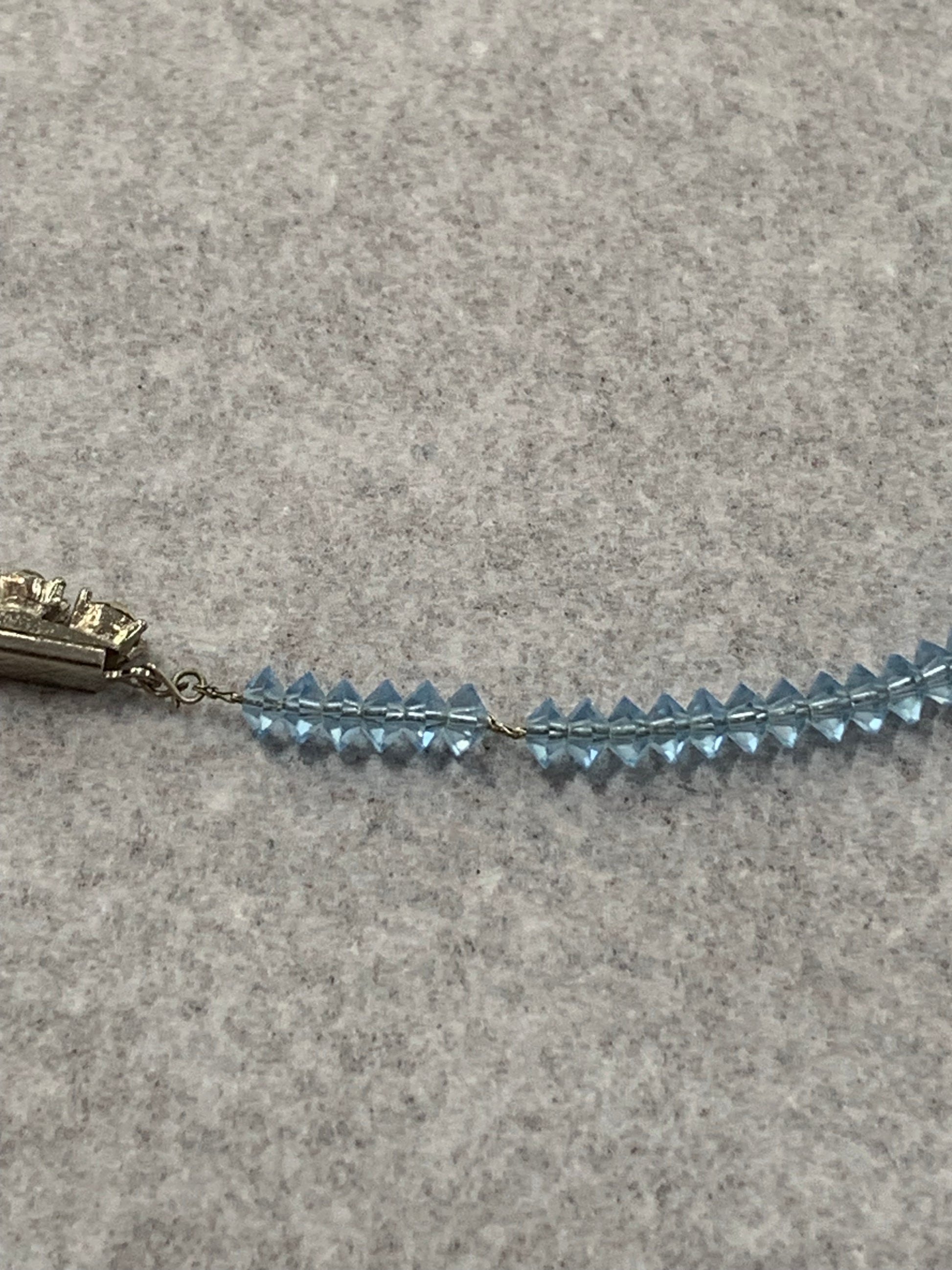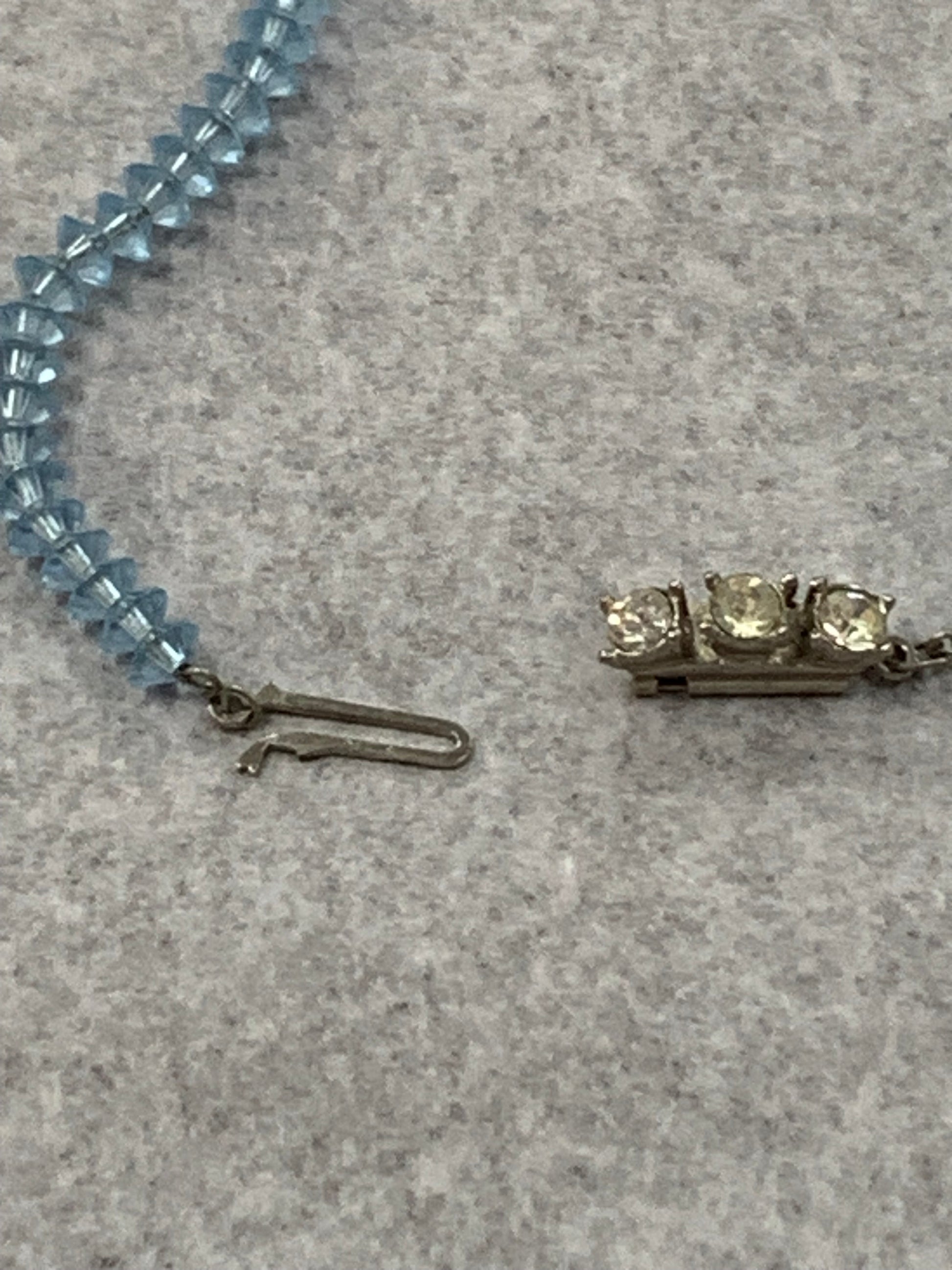 Vintage 1960s light blue Murano glass bead necklace featuring faceted bicone-shaped beads in a pale blue colour . The necklace has an ornate silver-tone clasp with three clear rhinestones set in a decorative mounting. One bead is missing from the strand, creating a small gap, though this may not be highly noticeable when worn due to the overall design and bead placement.