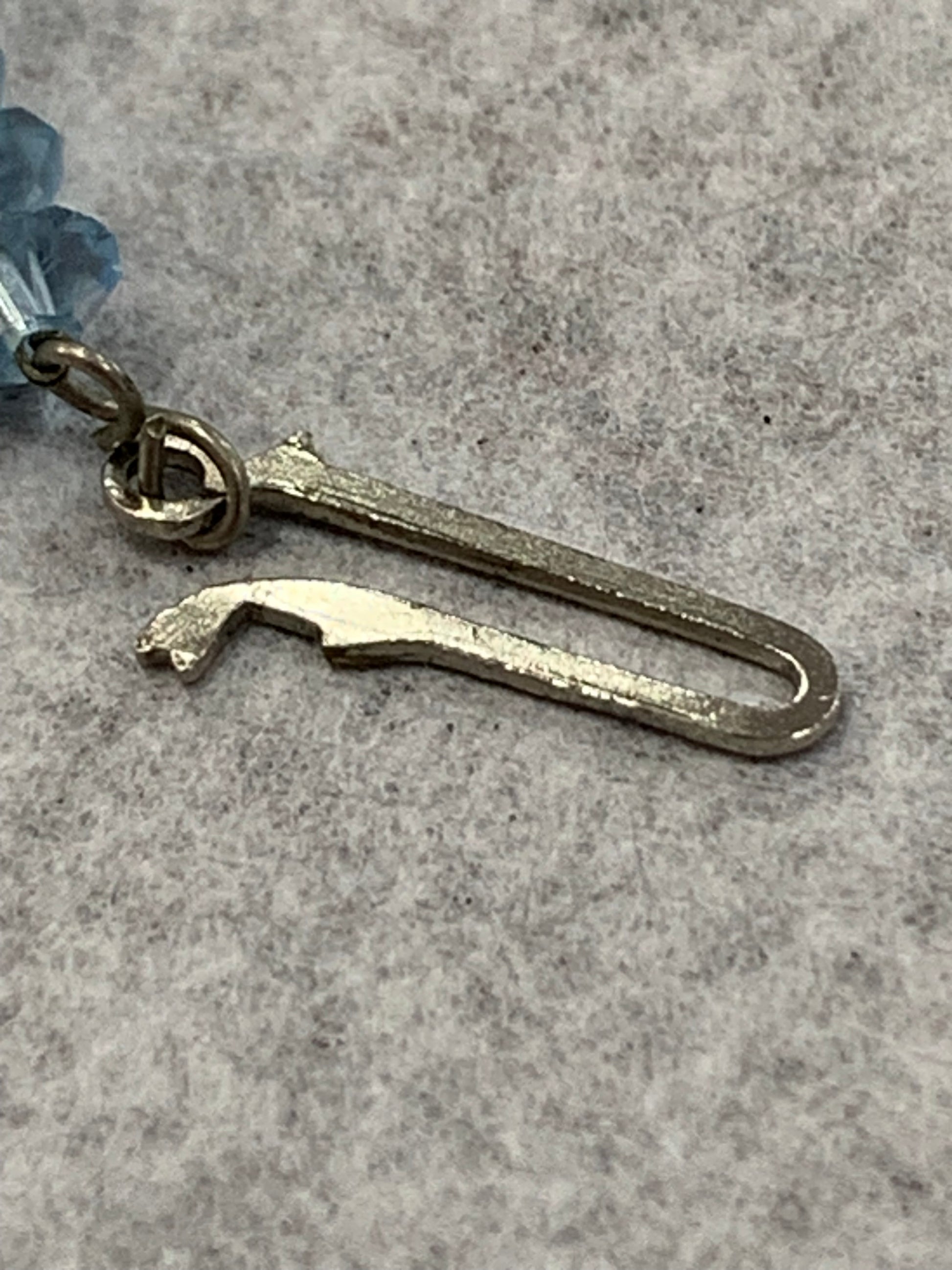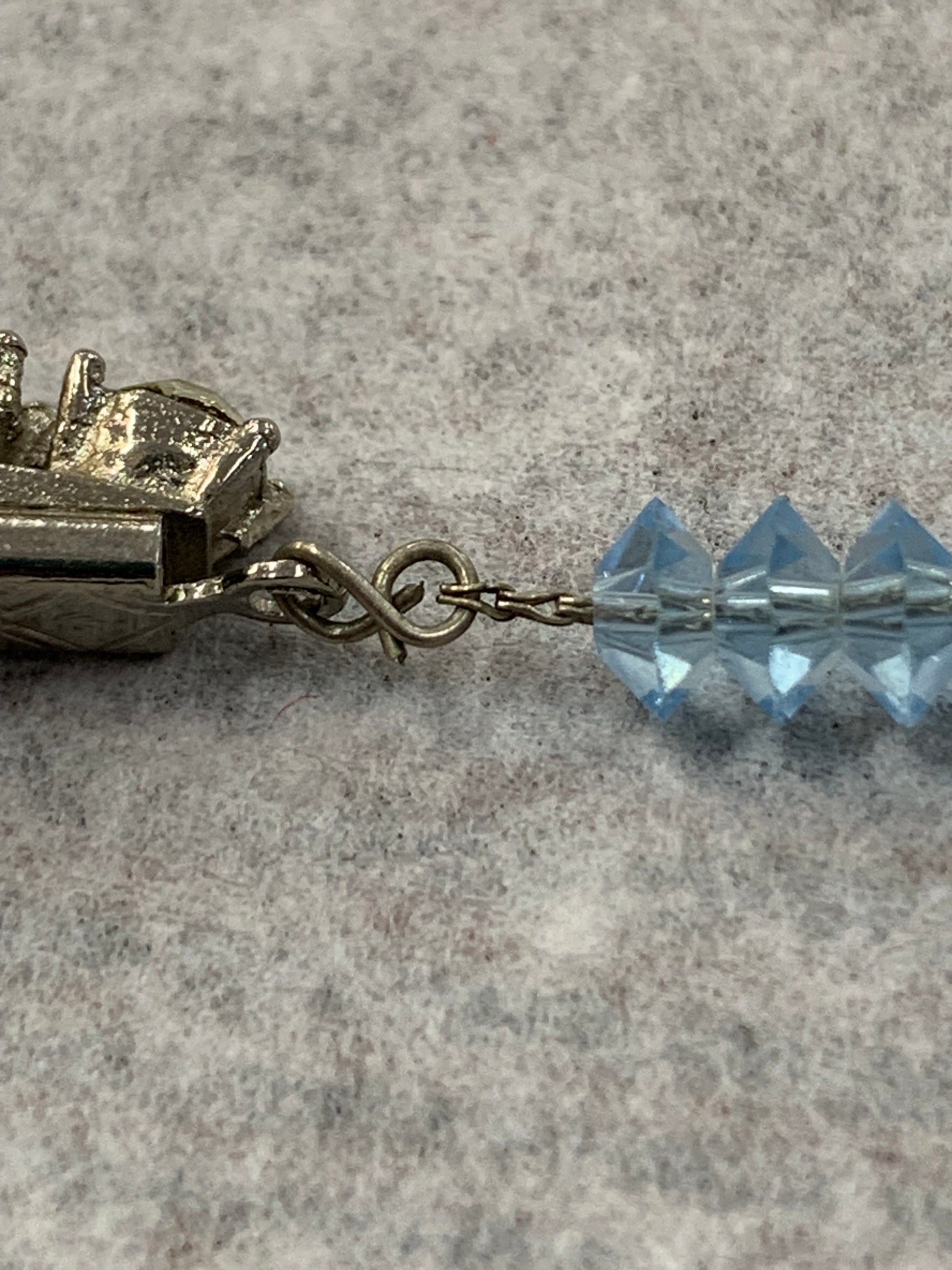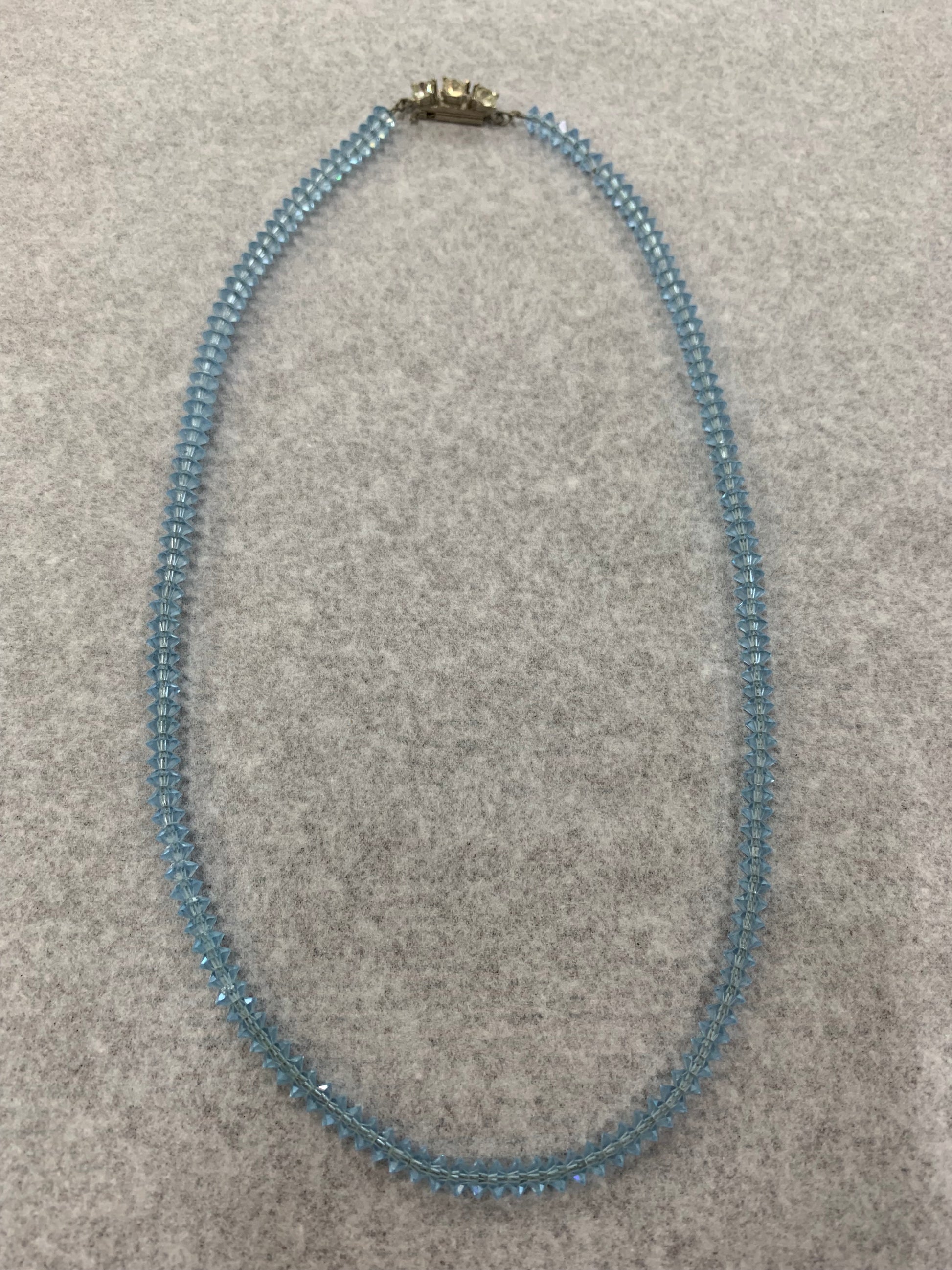 Vintage 1960s light blue Murano glass bead necklace featuring faceted bicone-shaped beads in a pale blue colour . The necklace has an ornate silver-tone clasp with three clear rhinestones set in a decorative mounting. One bead is missing from the strand, creating a small gap, though this may not be highly noticeable when worn due to the overall design and bead placement.