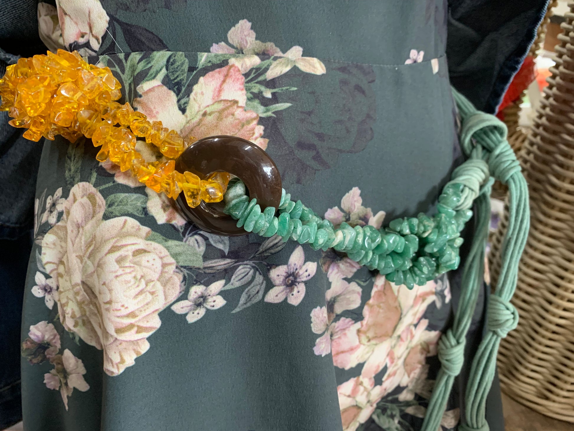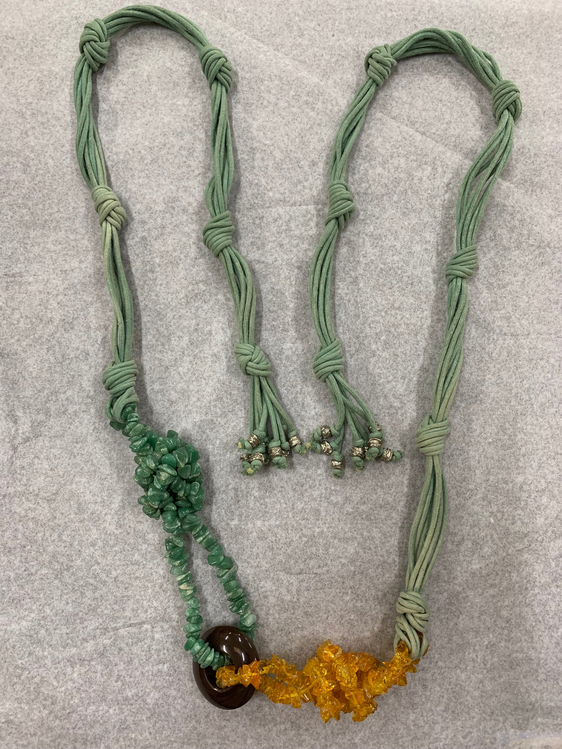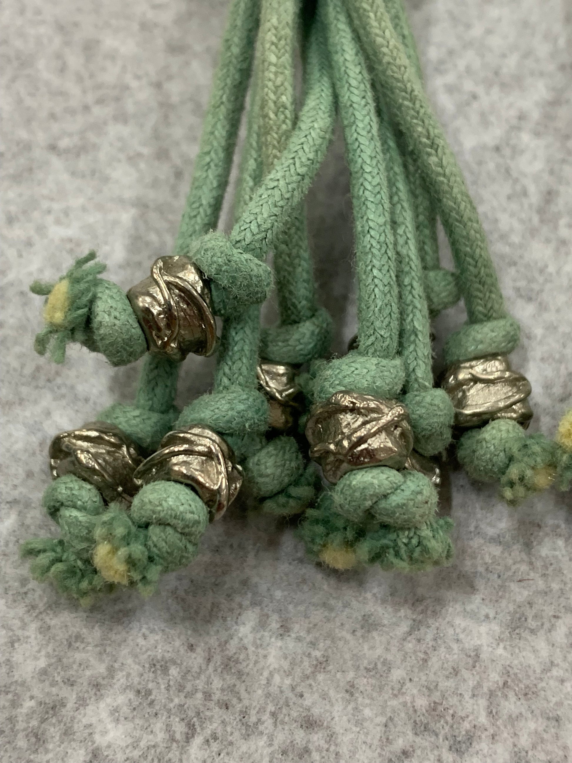 A very funky belt with adjustable tie closure with tasseled ends. There is a little bit of age fading on the cord but a lovely belt nevertheless that fits well into the bohemian/hippie aesthetic.