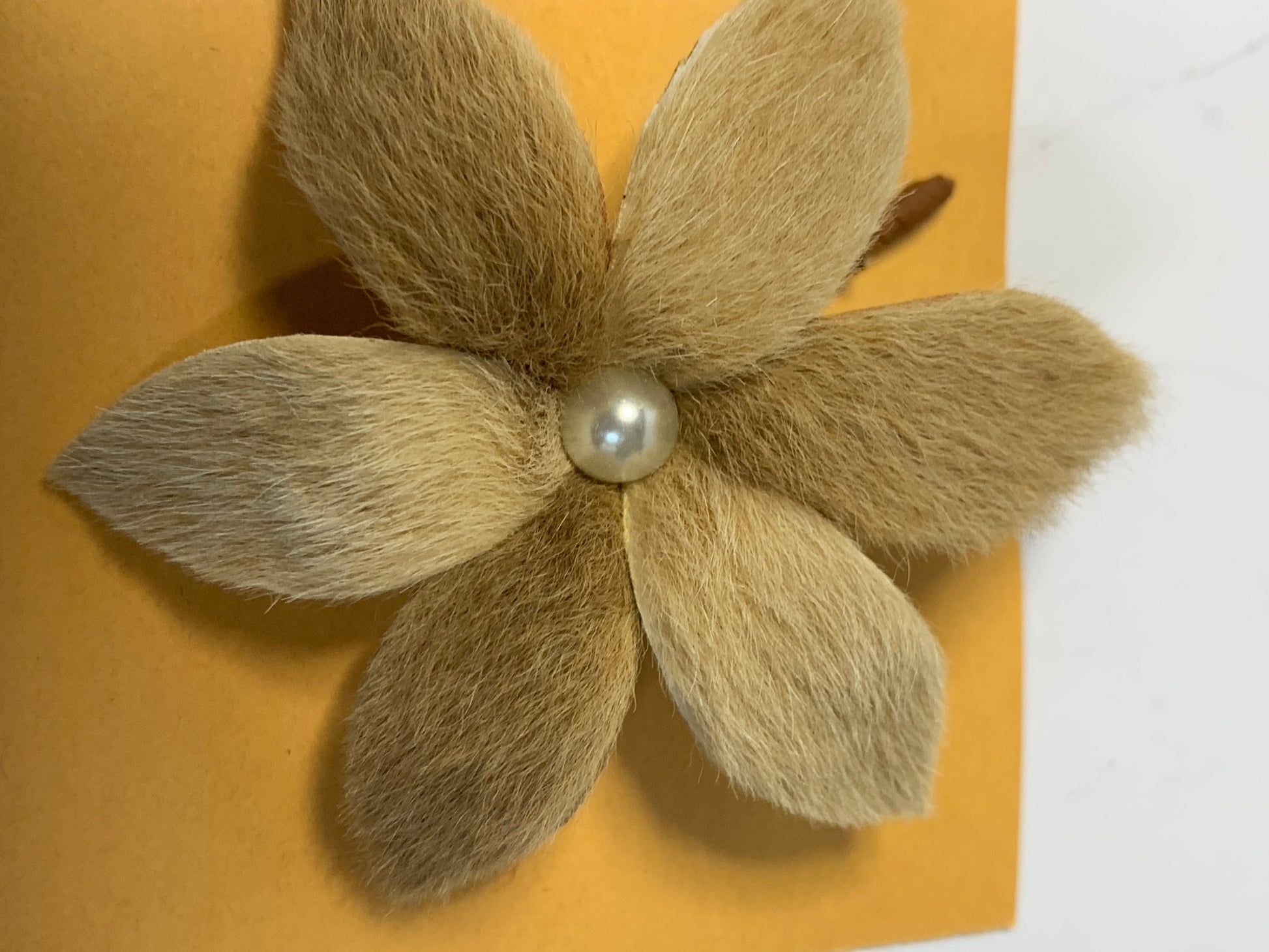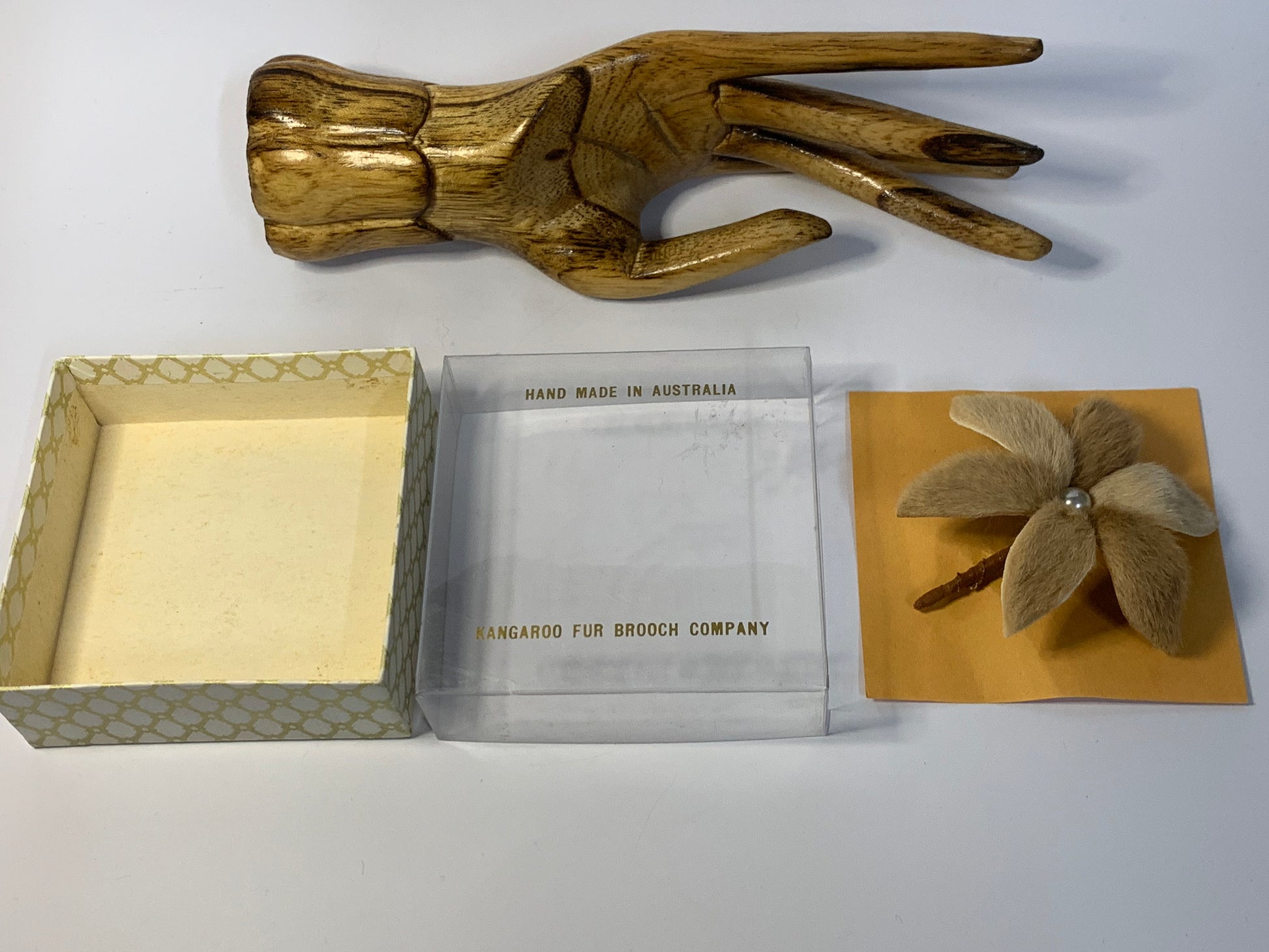 • Kangaroo fur flower brooch: Six-petaled flower design made from genuine kangaroo fur with a pearl center, mounted on orange/yellow card backing• Original presentation box: Clear plastic display box with “Hand Made in Australia” and “Kangaroo Fur Brooch Company” labeling. In new/unused condition with all original packaging intact. 1950s to 1970s.
