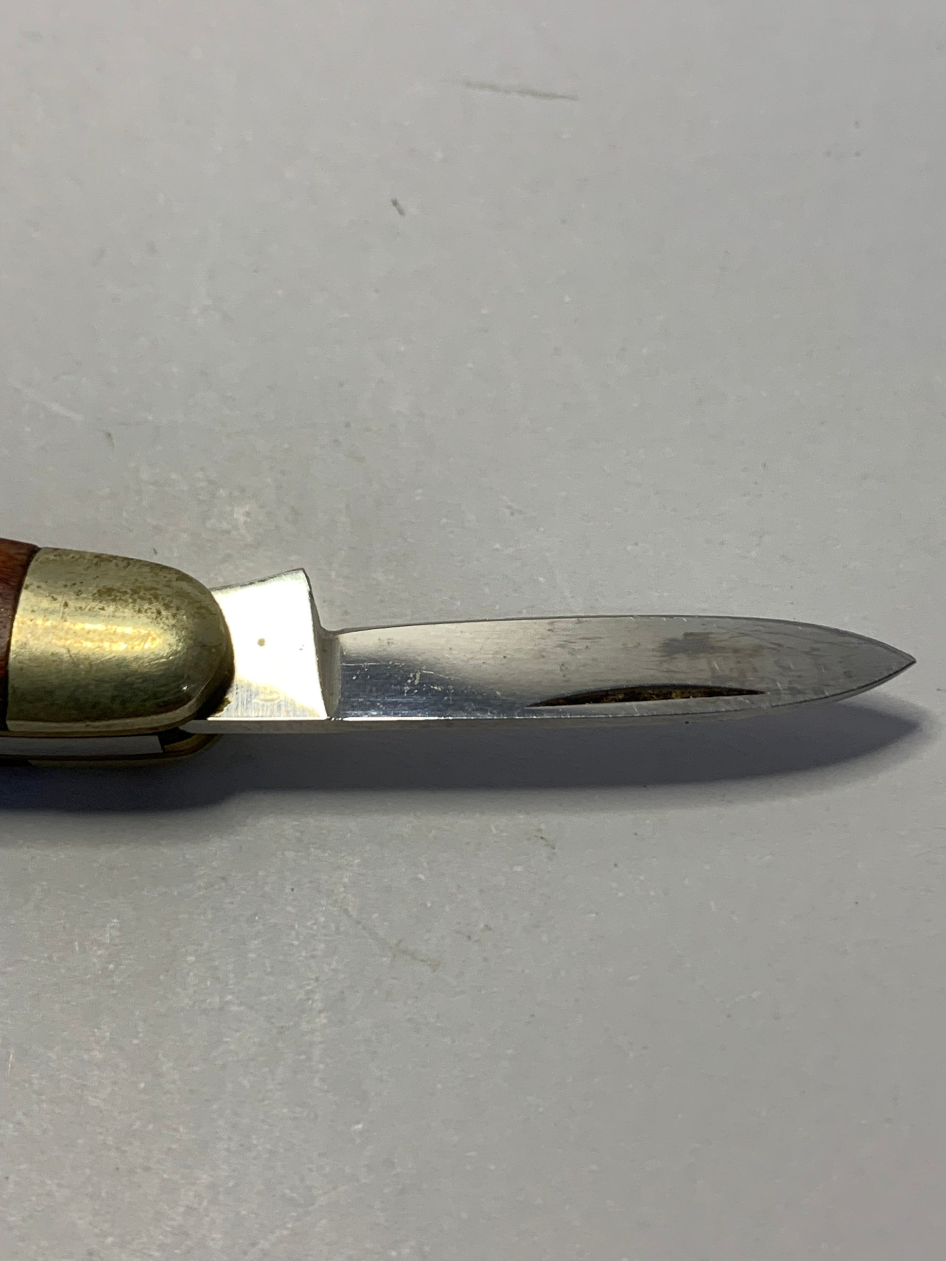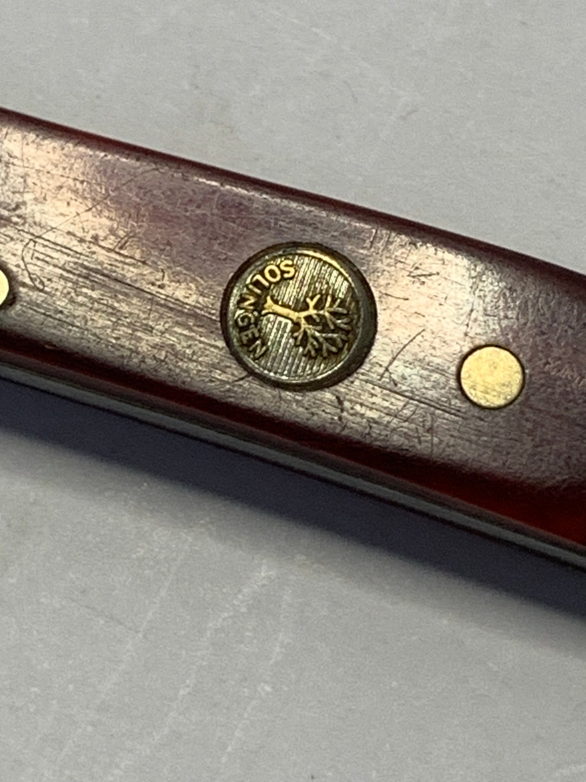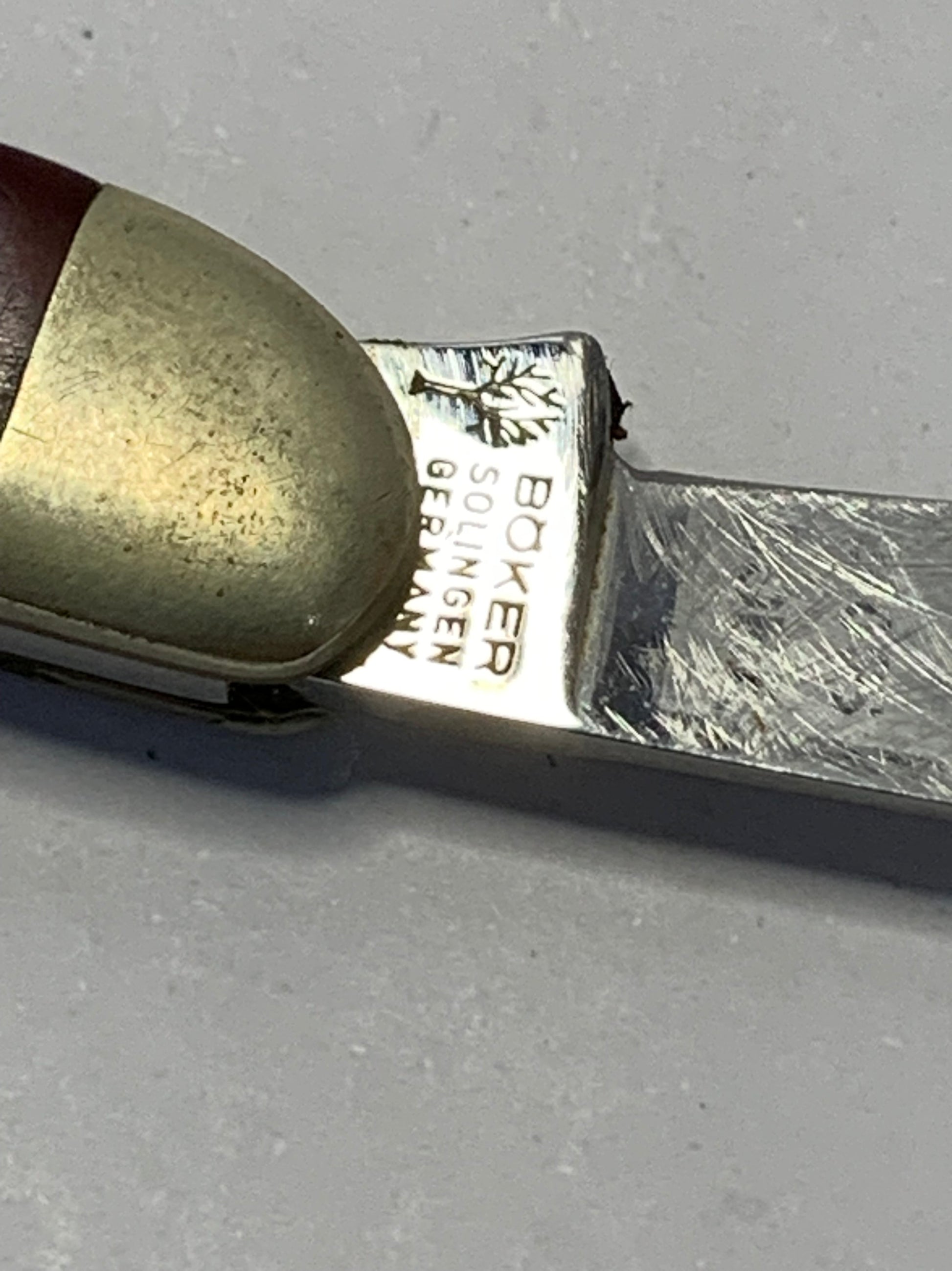 Vintage Boker Solingen Germany two-blade folding pocket knife. Measures 8cm (approximately 3.1 inches) when closed. Features classic design with wood grain handles (likely pakkawood or similar composite material) with brass bolsters and pins. The knife displays the distinctive Boker tree logo shield inlay and “Solingen” marking, indicating authentic German craftsmanship from the historic cutlery manufacturing region. Two stainless steel blades show etching consistent with vintage Boker production. The knife exhibits typical age-related wear including patina on the brass bolsters, surface scratches on handles, and minor blade wear. Both blades appear functional with good action. Traditional slip-joint mechanism. Likely manufactured in the mid-to-late 20th century (1960s-1990s based on styling and construction).