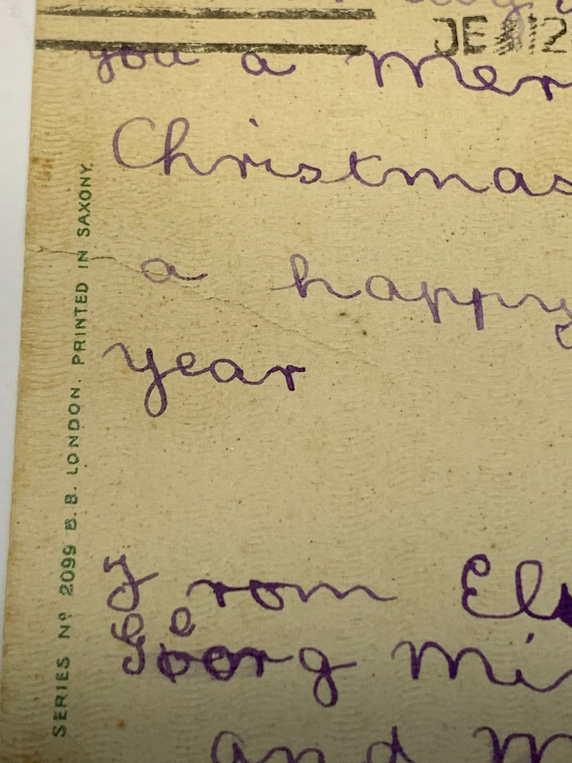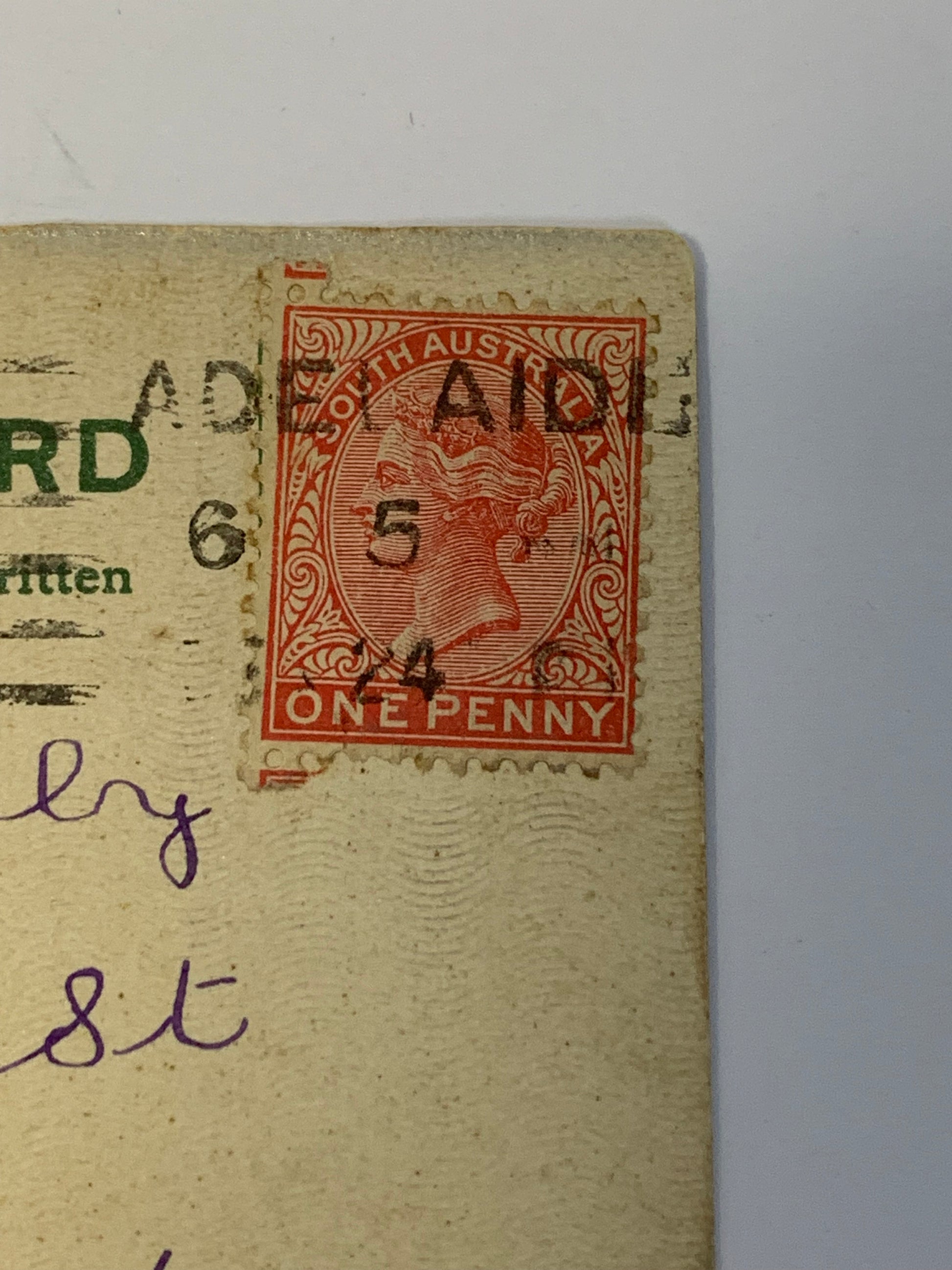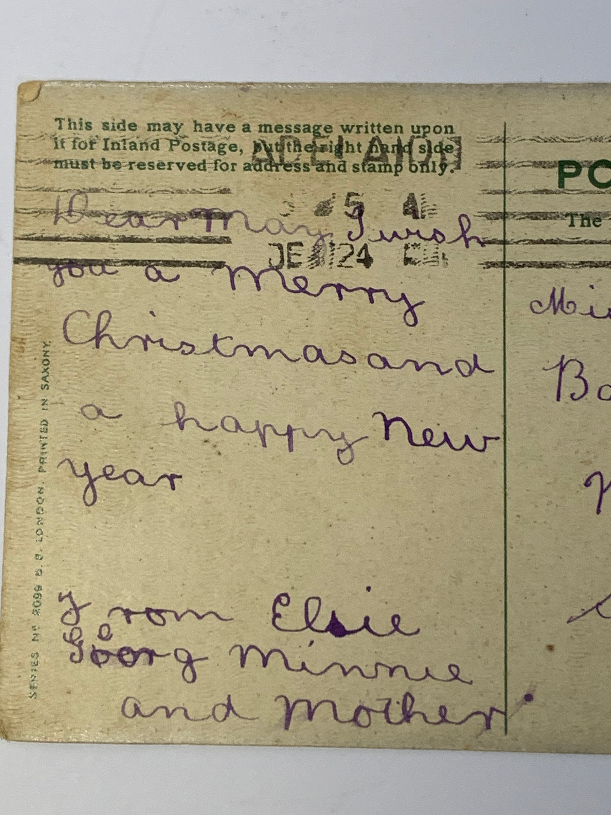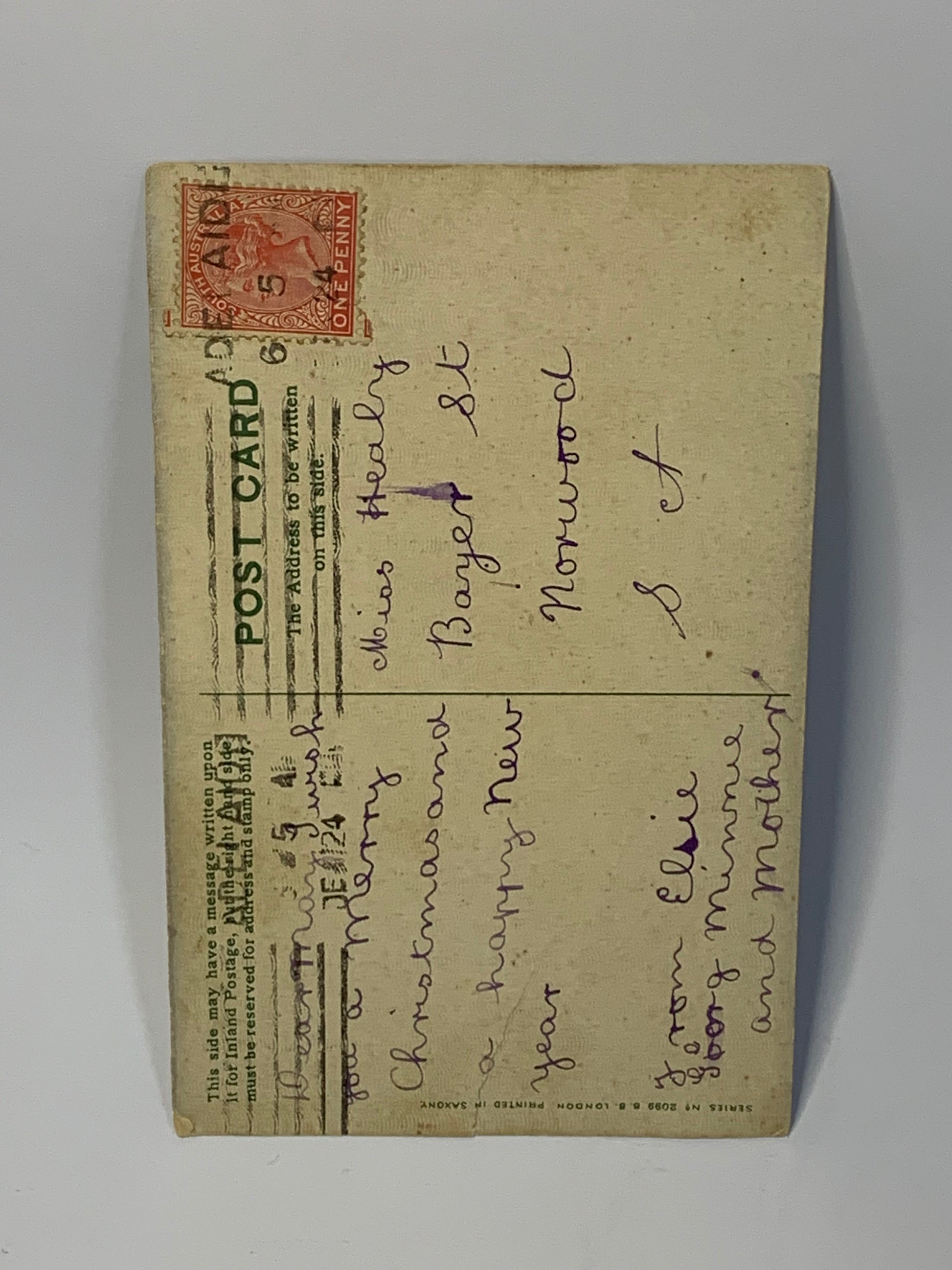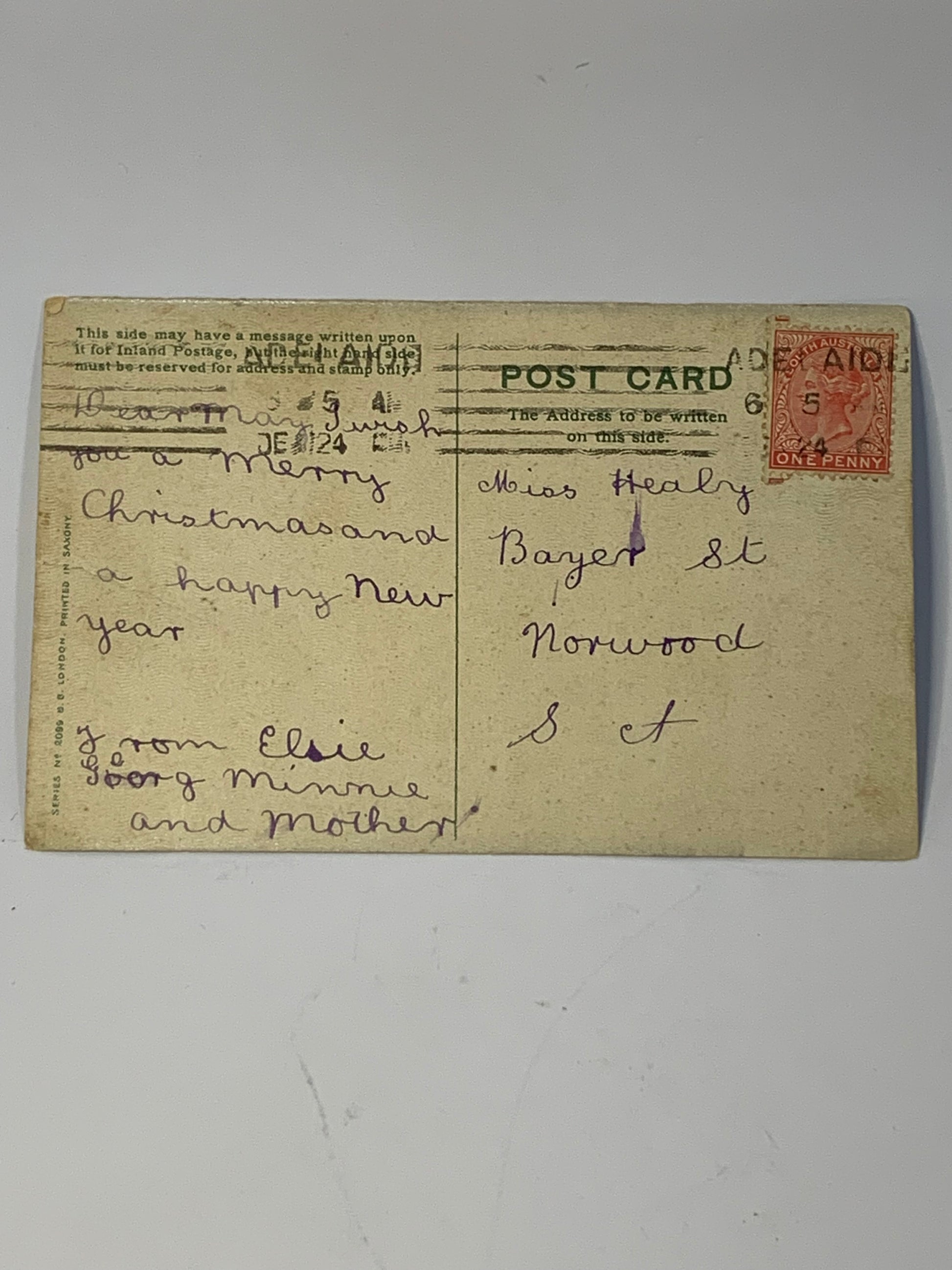 Back: Standard postcard format with an Australian one penny red stamp, postmarked and addressed to “Miss Healy, Bayer St, Norwood, S.A.” (South Australia). The handwritten message appears to be Christmas and New Year greetings signed by family members (“from Elsie,Georg, Minnie and Mother”).