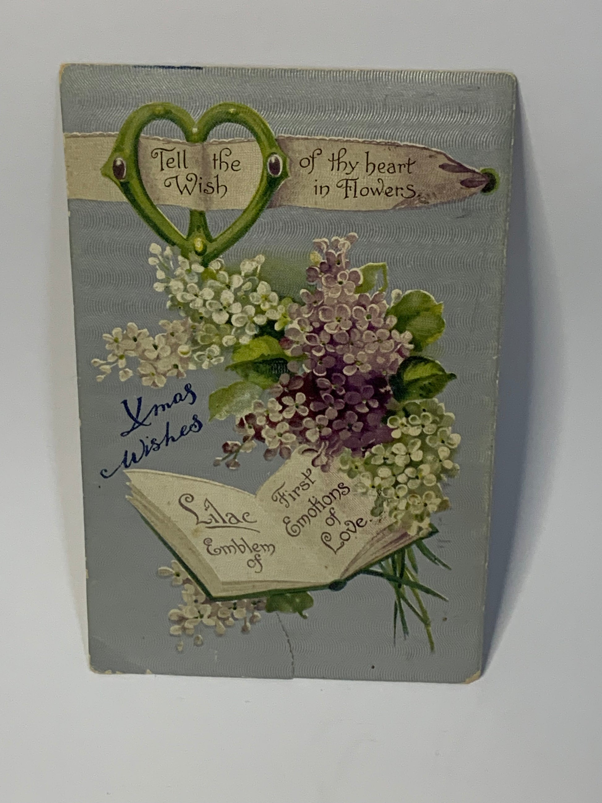 Front: An embossed floral design with lilacs in purple and white, a green heart-shaped decorative element, and text reading “Tell the Wish of thy heart in Flowers” and “Xmas Wishes.” There’s also a small banner with “Lilac Emblem of First Emotions of Love.”