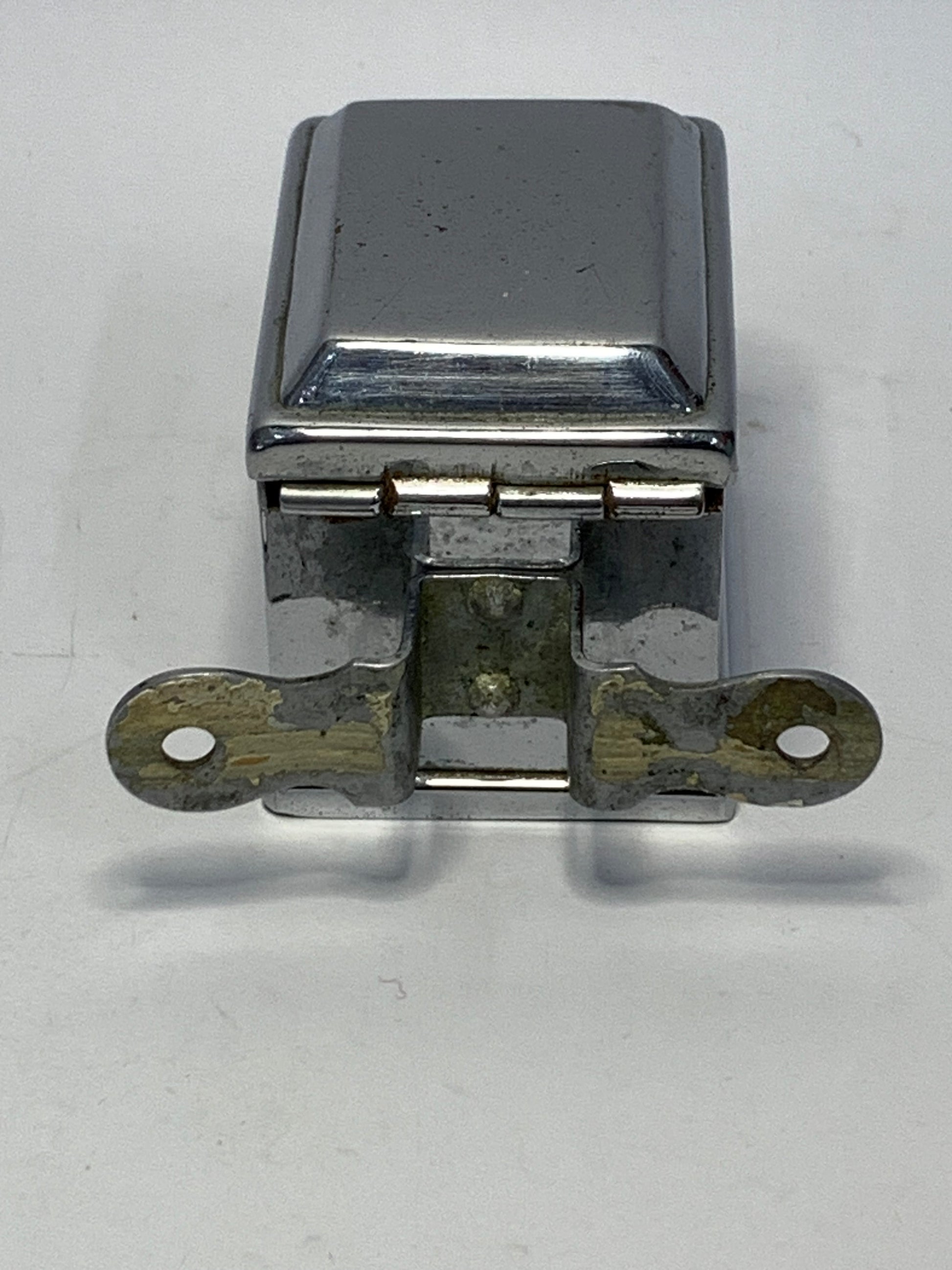 Condition: Shows age-appropriate wear with some surface scratches, minor patina, and oxidation on the mounting hardware. Chrome finish remains largely intact and shiny. Hinged lid functions properly. Interior shows honest use and aging.