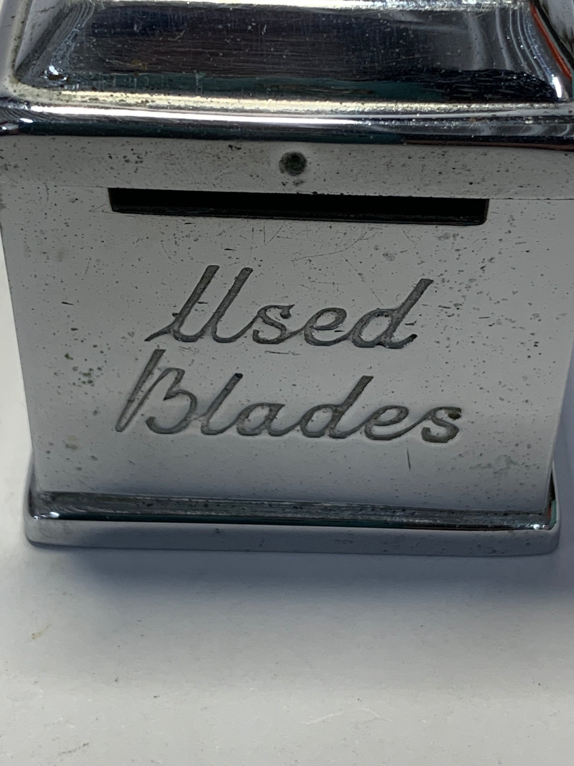 A charming piece of bathroom history! This chrome-plated wall-mounted container was designed for the safe disposal of used safety razor blades. Features elegant script engraving reading “Used Blades” on the front panel.