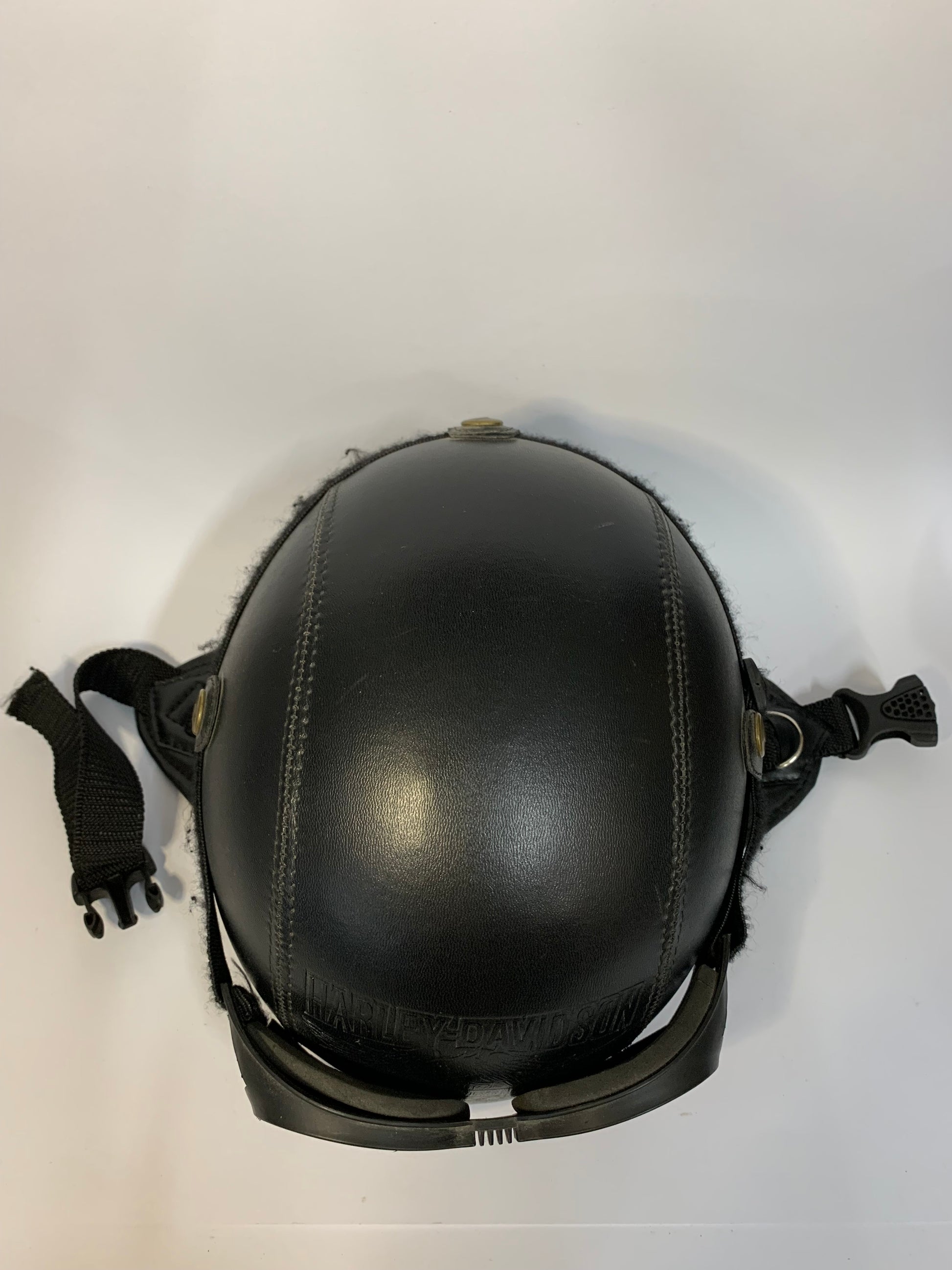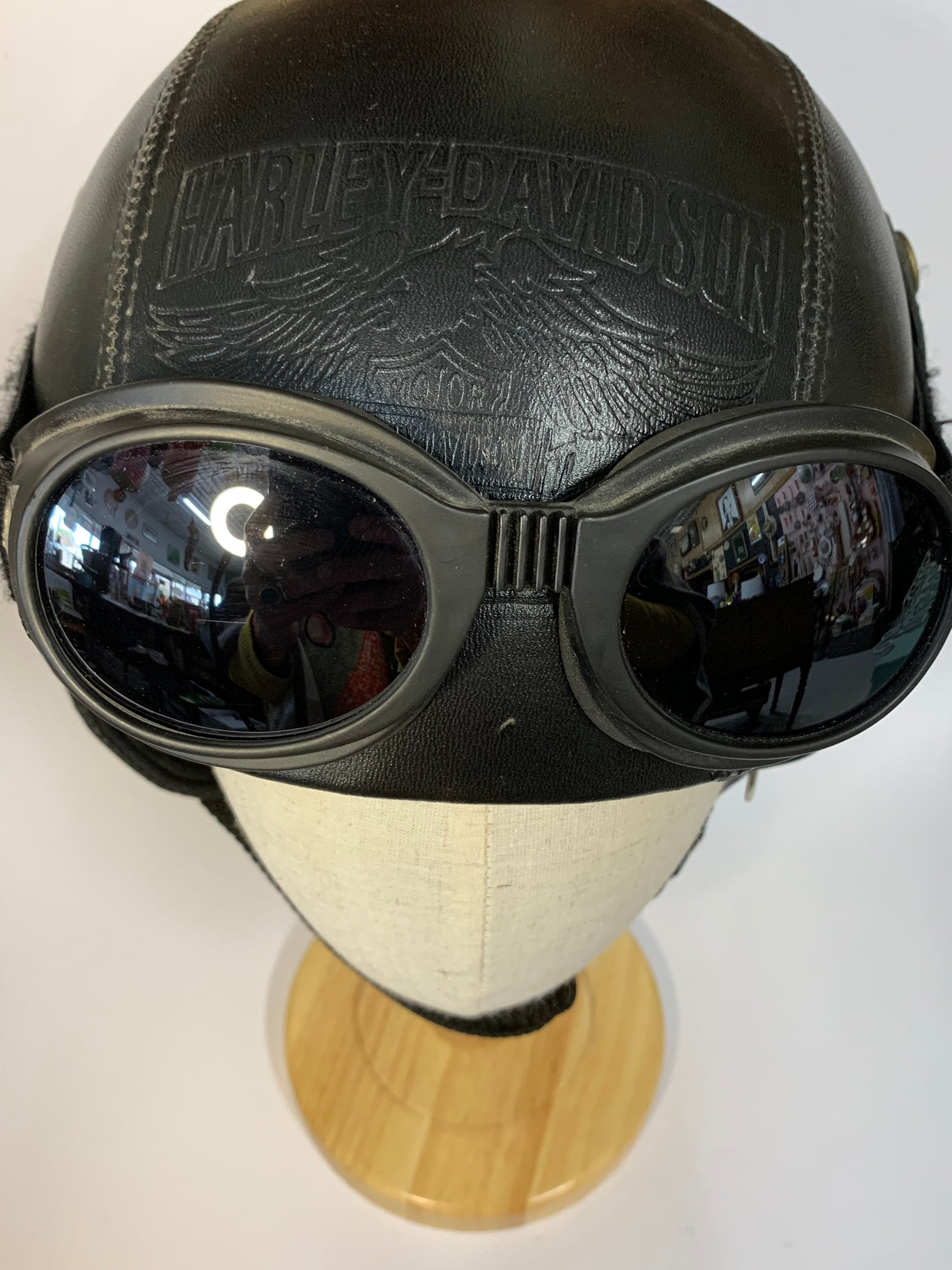 This is a costume or fashion accessory designed to replicate the look of a vintage motorcycle helmet. Embossed with Harley Davidson logo with eagle wings design. The aviator goggles are attached. This is purely a costume piece or collectible display item.