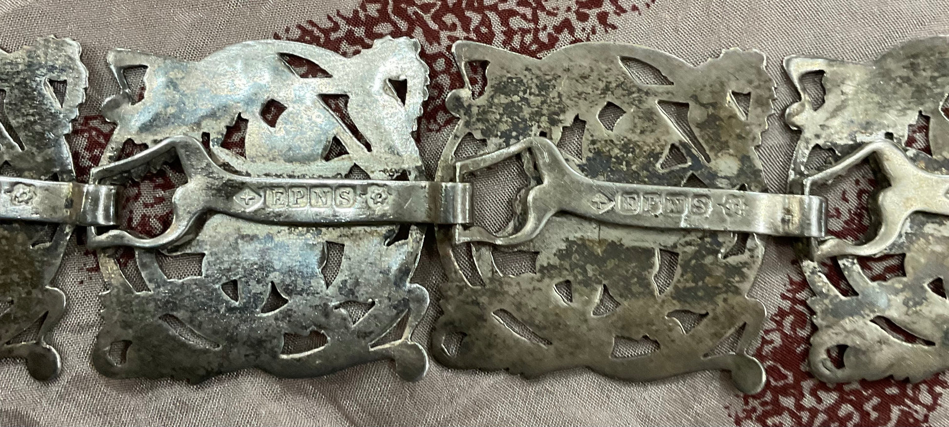 The reverse of the panels shows a clear hallmark: “EPNS” (Electroplated Nickel Silver), indicating it is silver-plated rather than solid sterling silver. EPNS was widely used in the late 19th and 20th centuries for decorative belts, buckles, and jewelry. The hallmarking and construction show this belt is British-made, possibly dating between the 1930s–1960s.