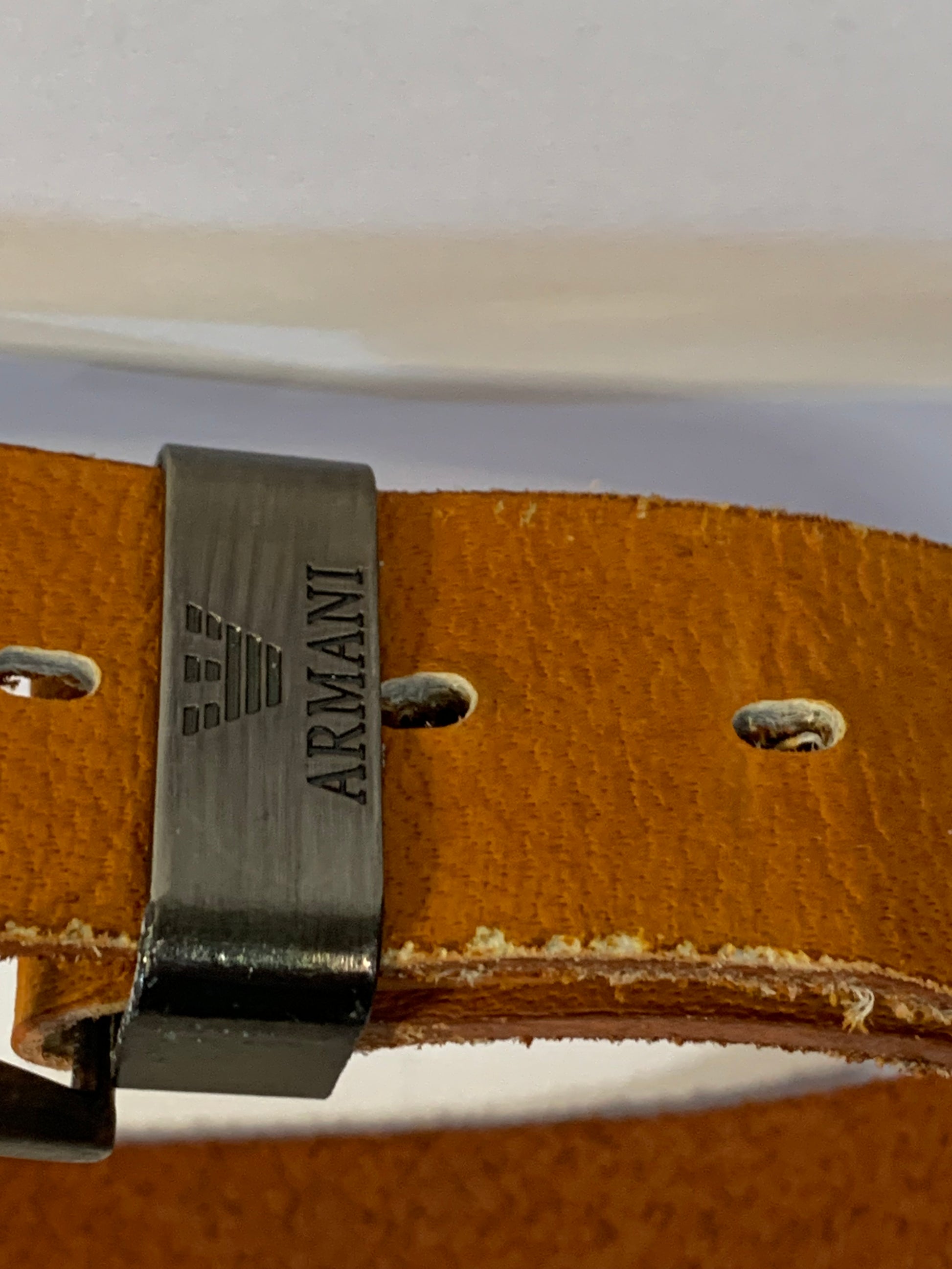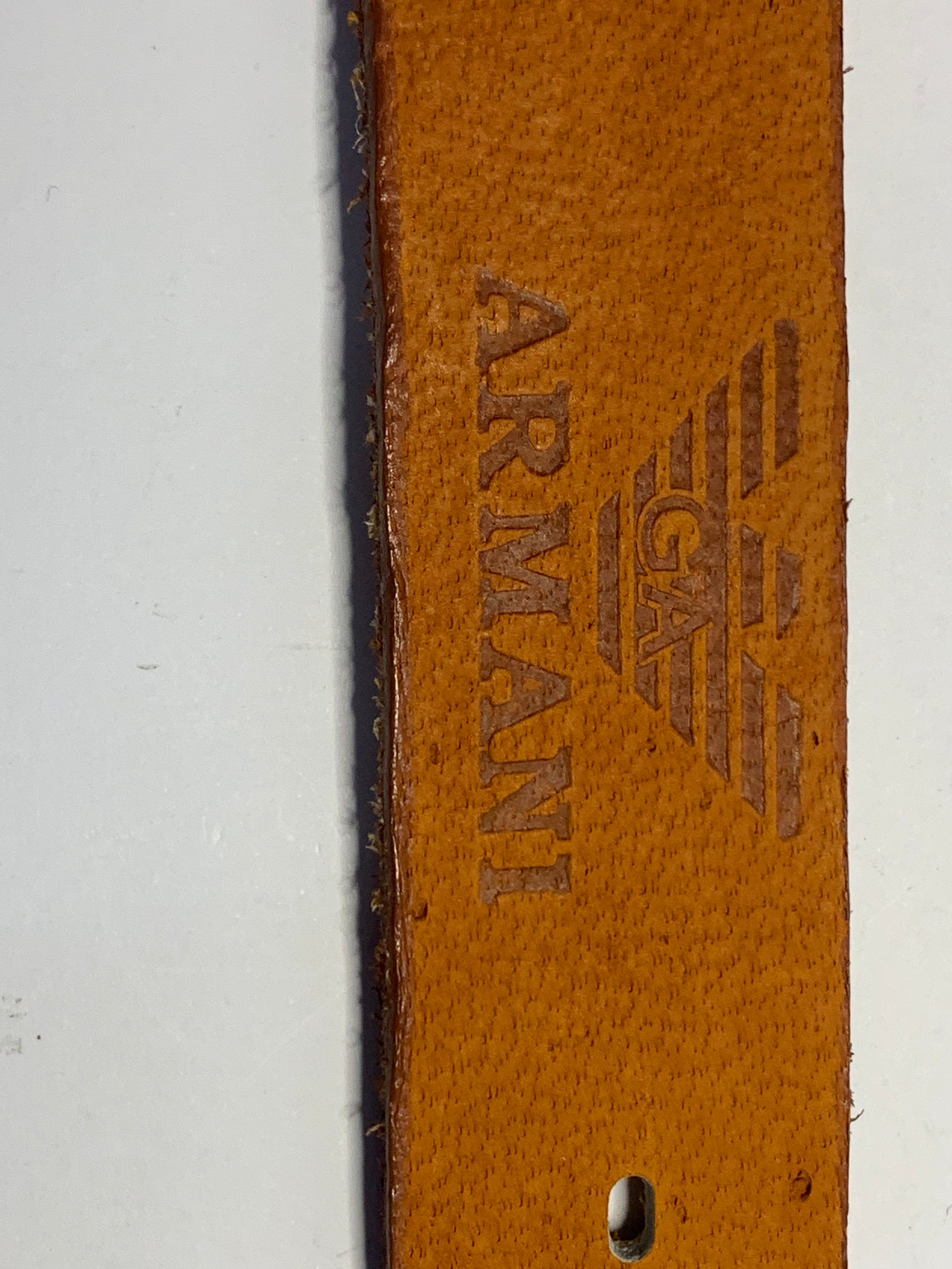 Vintage Armani leather belt in tan brown with engraved logo on the strap and embossed branding on the metal buckle and keeper. The belt has a raw leather interior and a simple silver-tone buckle design. Classic and versatile, it works well with jeans or casual trousers.