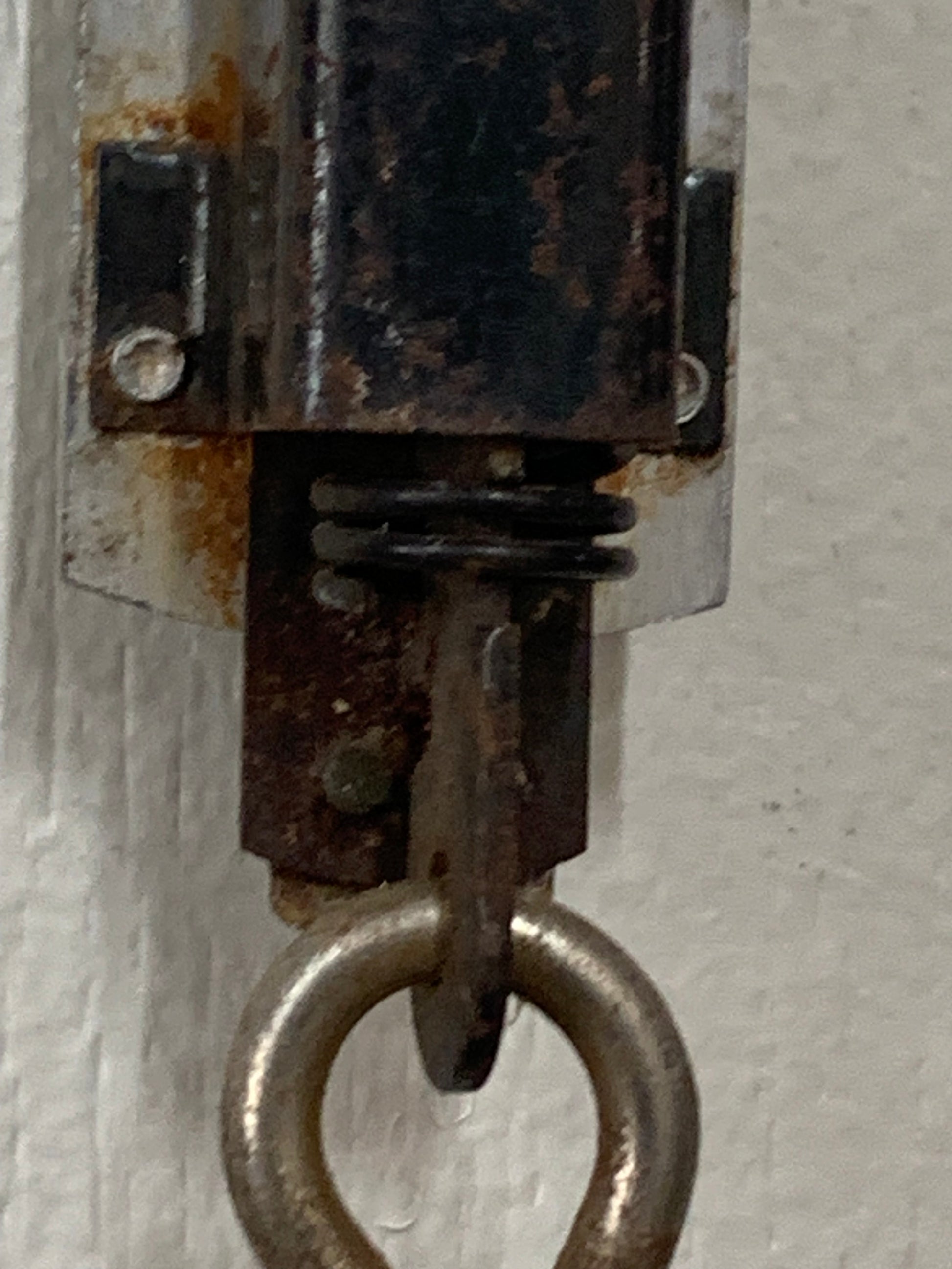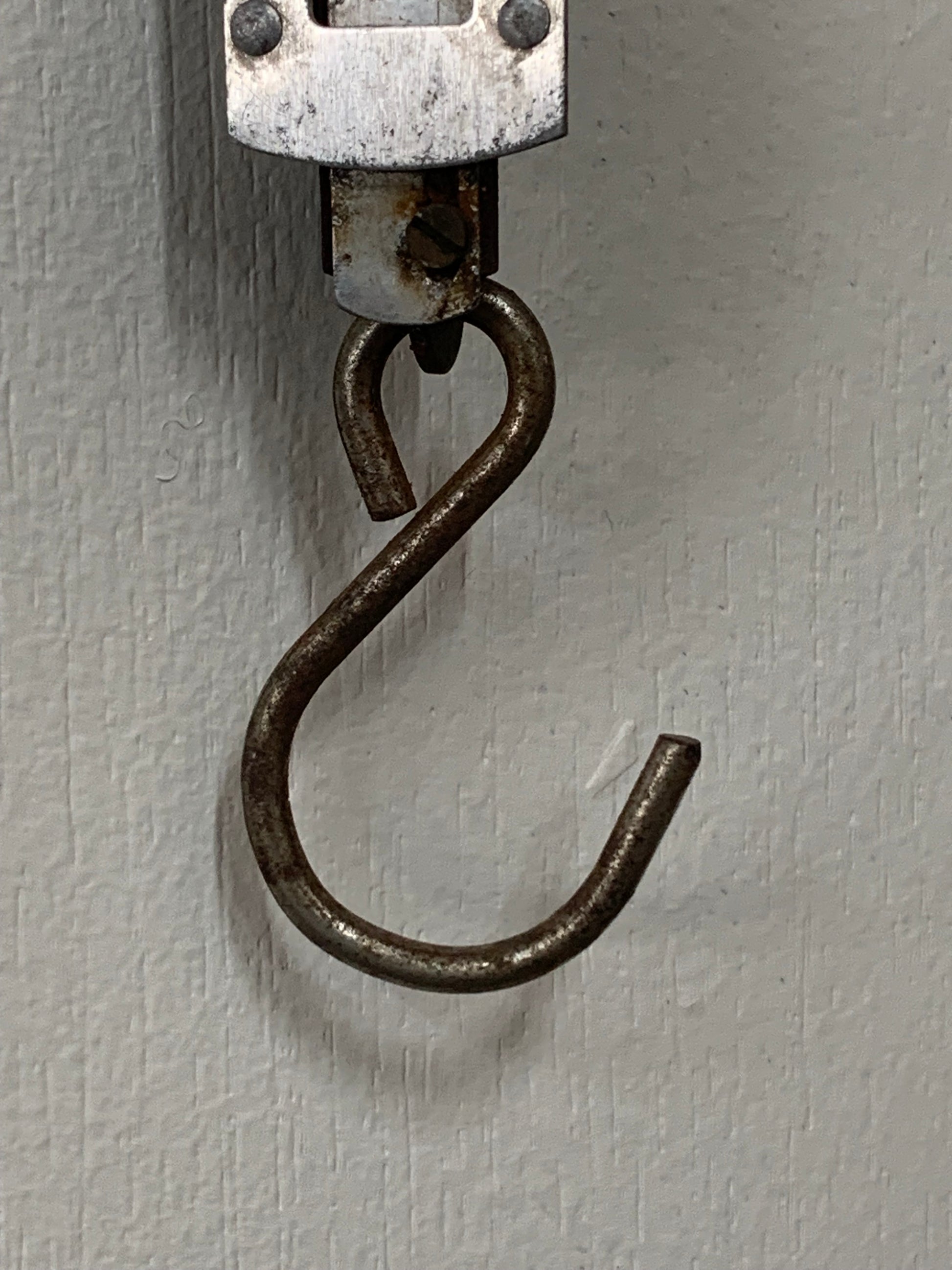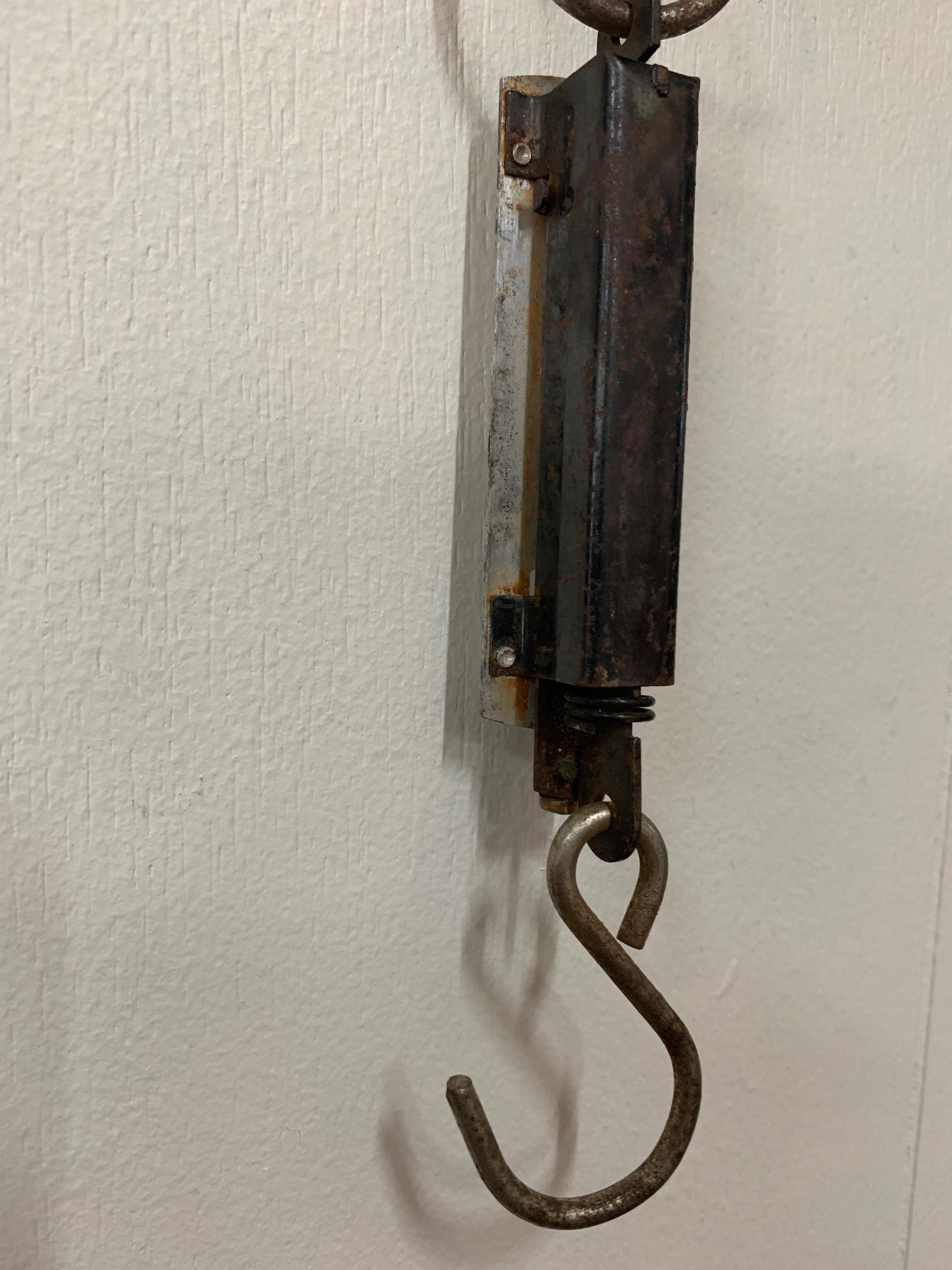 The mechanism operates via an internal spring system visible through the viewing window, with a pointer that moves along the graduated scale as weight is applied to the S-hook. The unit shows honest wear consistent with actual use, including surface patina and some rust on the hardware, which adds to its authentic vintage appeal.