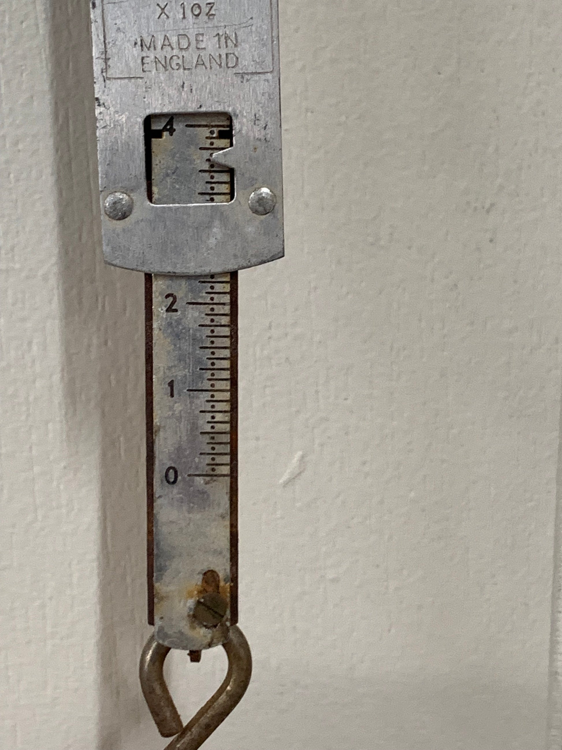 This authentic English-made spring scale features a robust aluminum or zinc alloy construction with clear graduated markings from 0-4 pounds. The scale includes “TO WEIGH x 4LB x 1OZ” specifications and “MADE IN ENGLAND” markings, indicating quality British manufacturing likely from the mid-20th century.