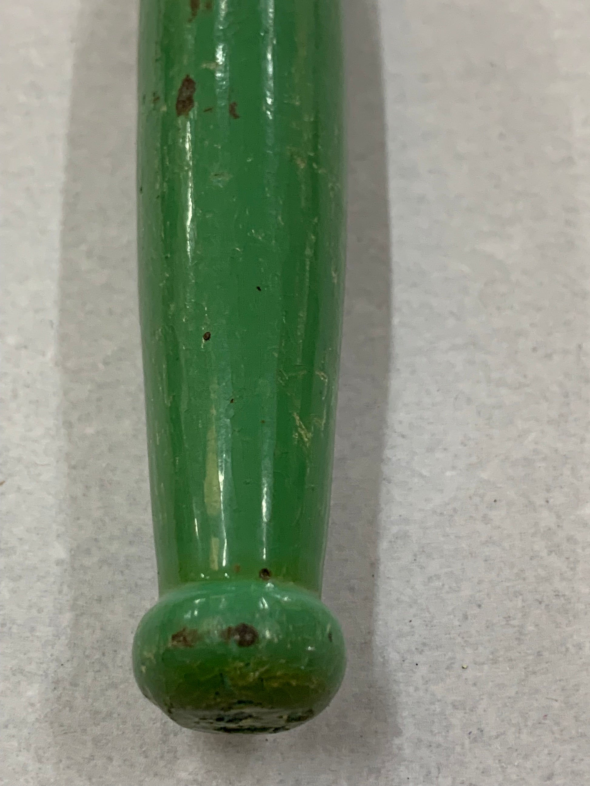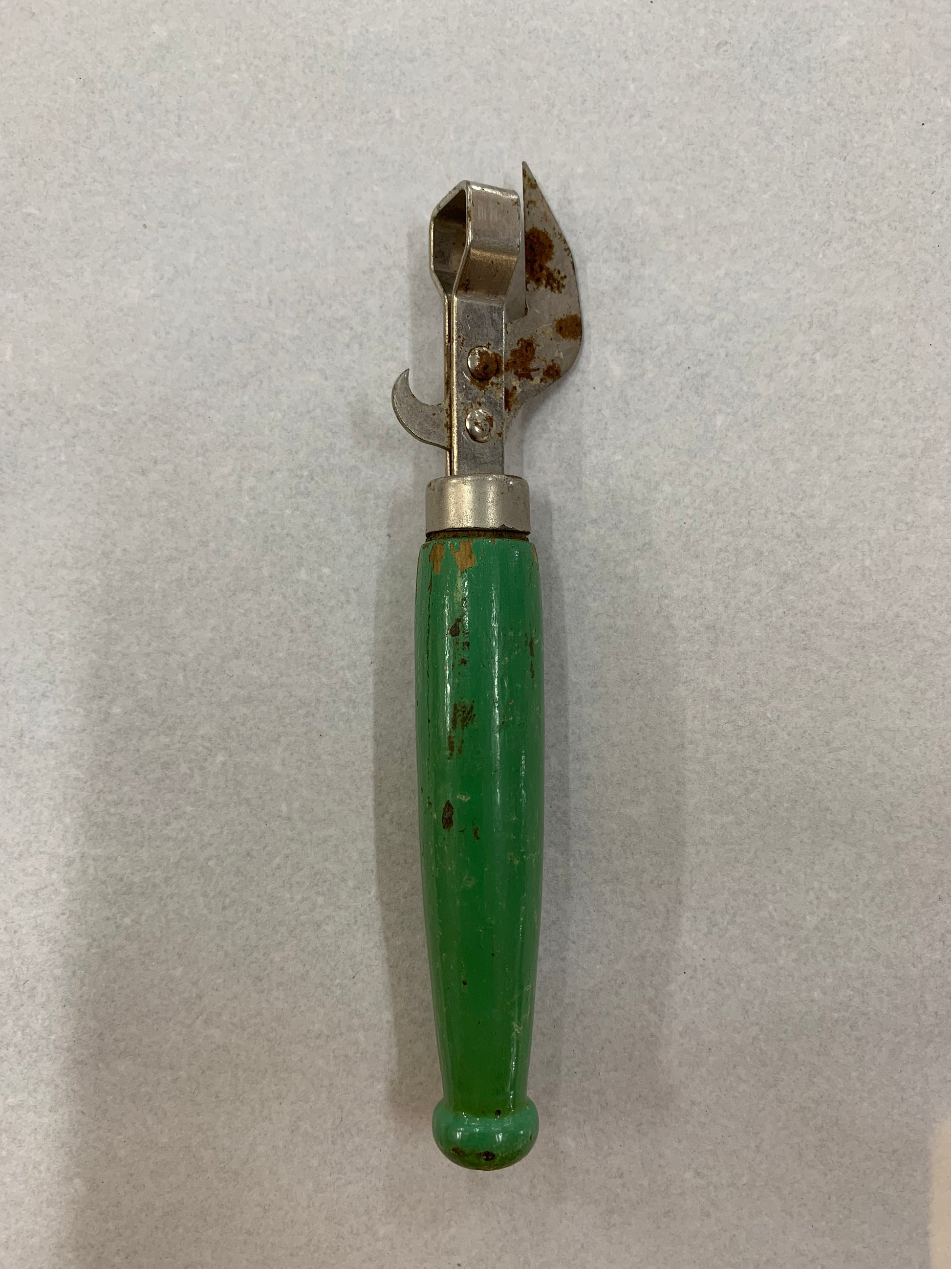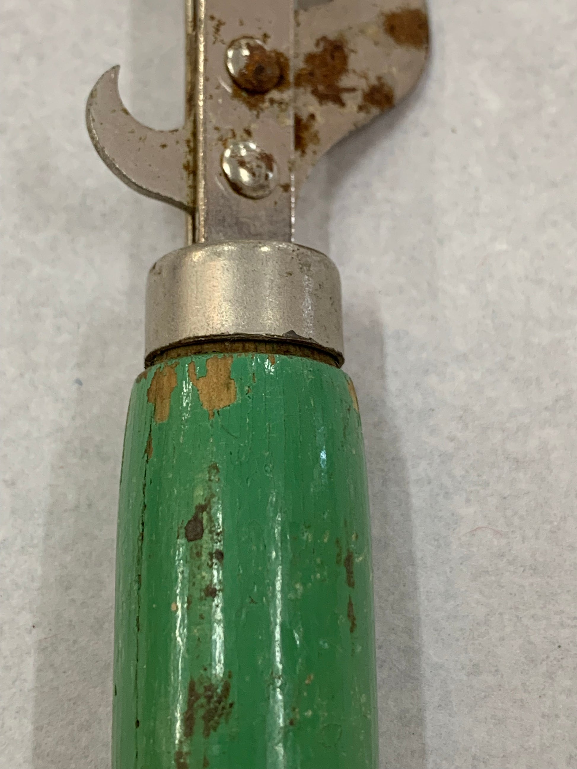 This is a classic hinged can opener with a green painted wooden handle and chrome-plated metal mechanism. The opener features a curved cutting blade with a sharp point for piercing cans, secured with two visible rivets. The handle shows characteristic wear and patina consistent with age and use, with some paint chipping and rust spots on the metal components. The side view reveals the traditional bottle opener loop integrated into the design. This style was popular from the 1940s-1960s and represents the standard kitchen can opener design before electric models became common.