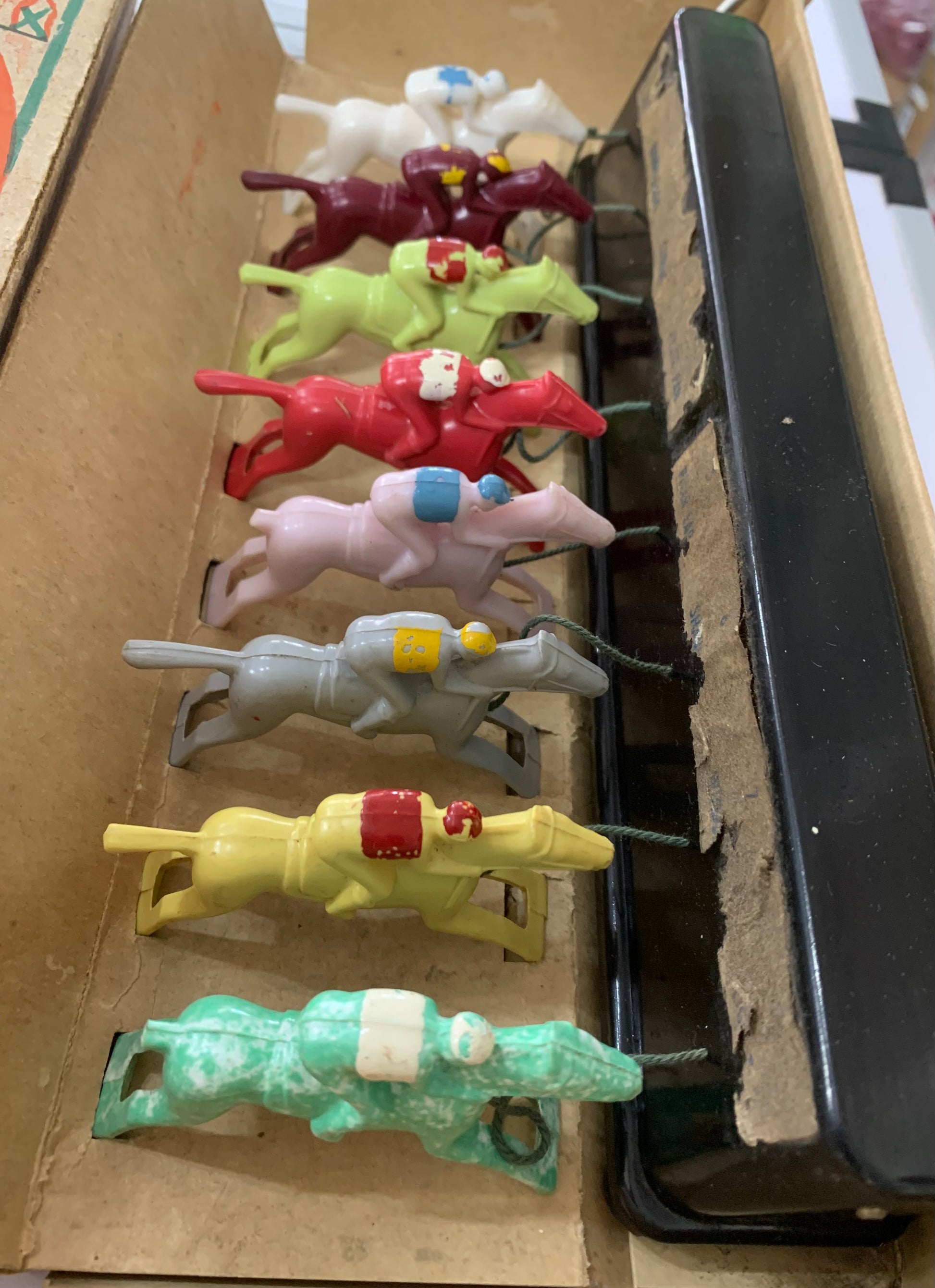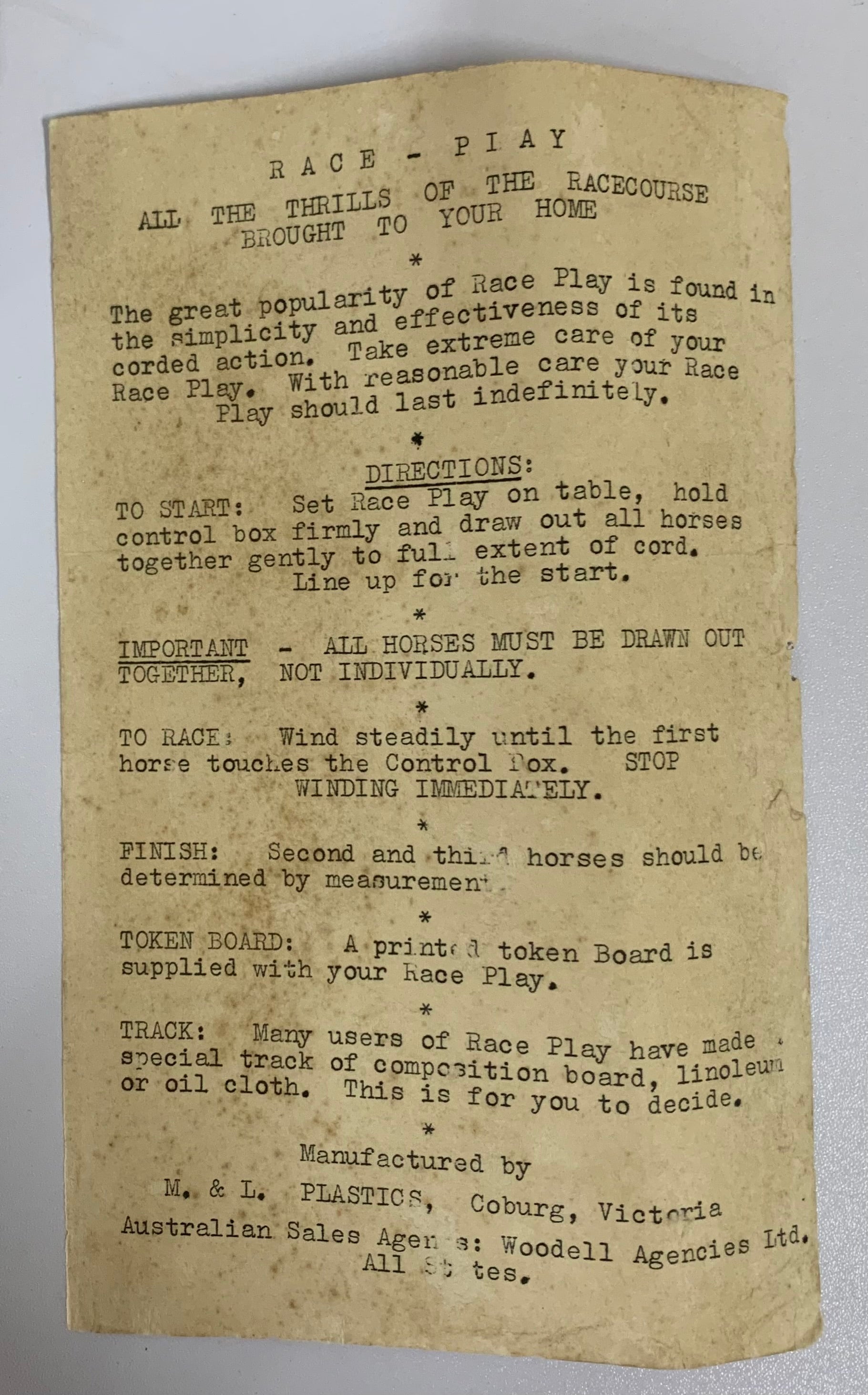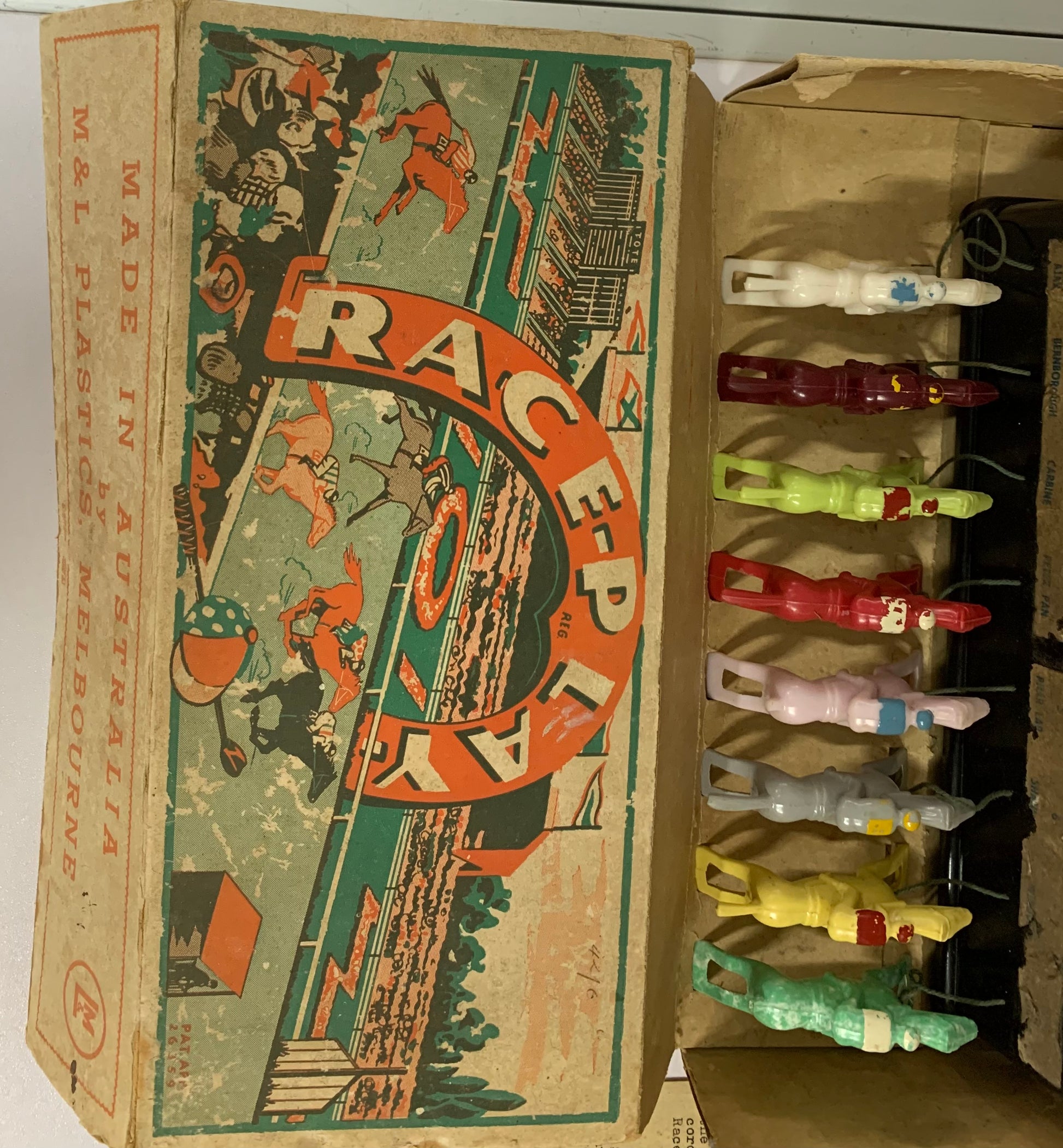 This is a charming vintage Australian toy from M&L Plastics, Melbourne - a mechanical horse racing game called “Race-Play” that brings the excitement of the racetrack into your home. Manufactured shortly after World War 2, around 1945. Collectible and rare and the control box is made of Bakelite.