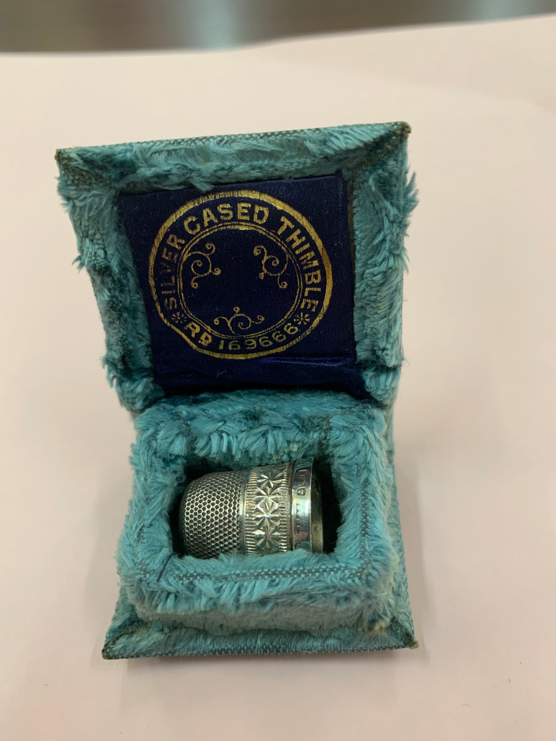 • Presentation: Comes with original fitted case lined in turquoise/teal plush fabric with “SILVER CASED THIMBLE” label