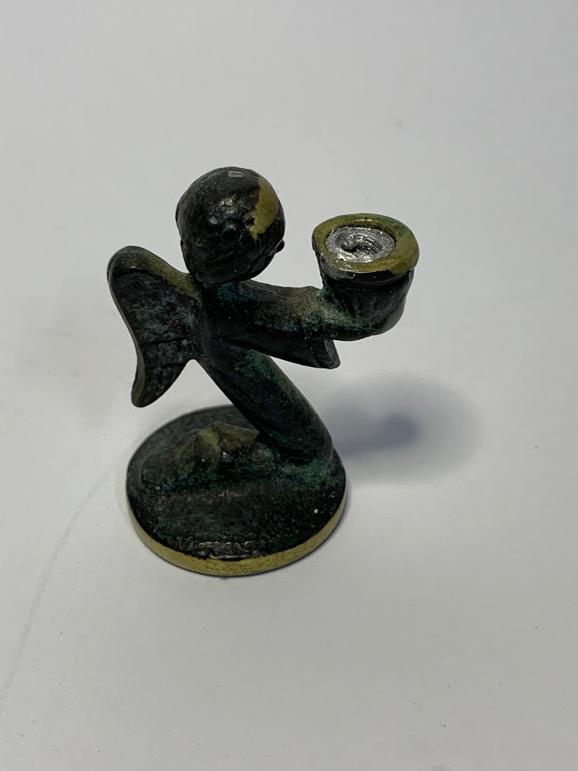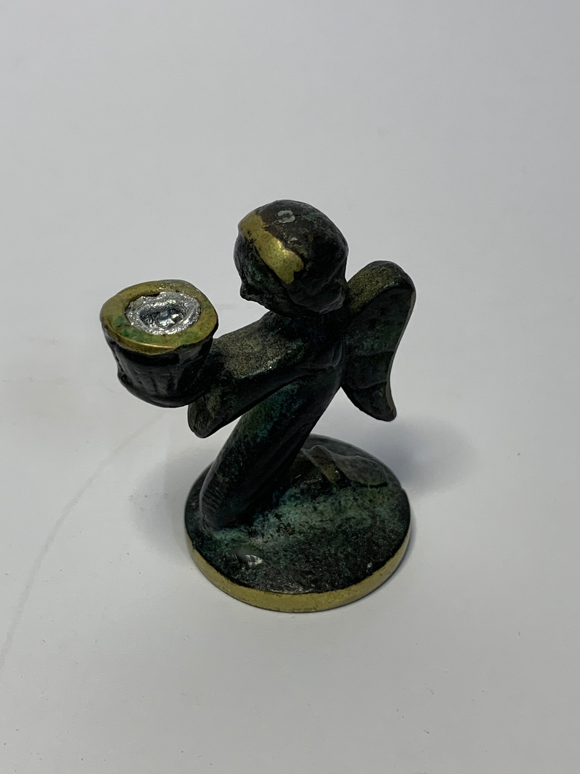 The modernist Austrian sculptor and ceramist was best known for his distinctive “Black Golden” series of decorative objects and figurines, particularly his hedgehog ashtrays. This “Black Golden” series, like this candle holder featured pieces with dark patinated surfaces and brass or gold accents. Authentic and highly collectible piece.